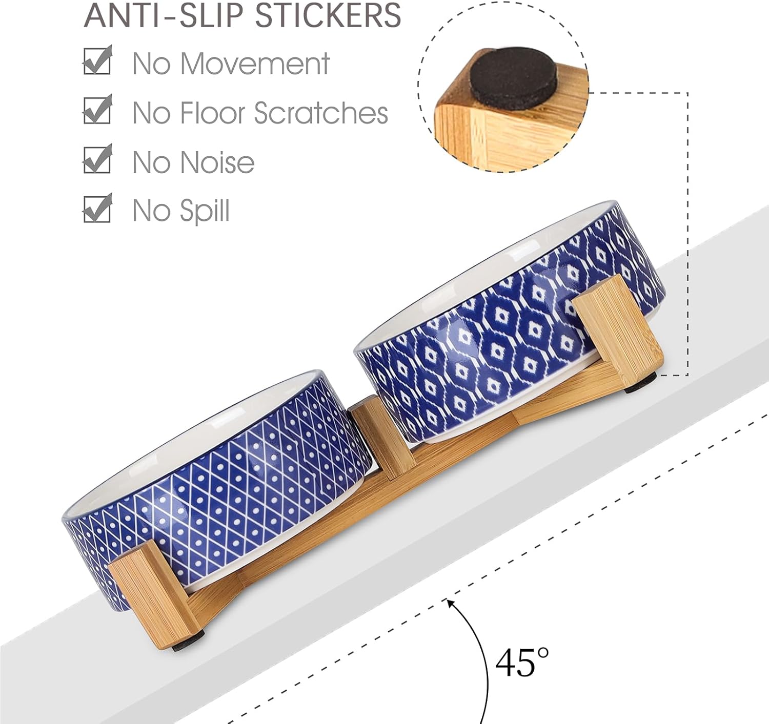 Selamica Ceramic 14 OZ Dog Bowls with Wooden Stand, Anti-Slip Dog Dishes Set for Cats & Small Dogs, Weighted Pet Bowls Set of 2, Vintage Blue