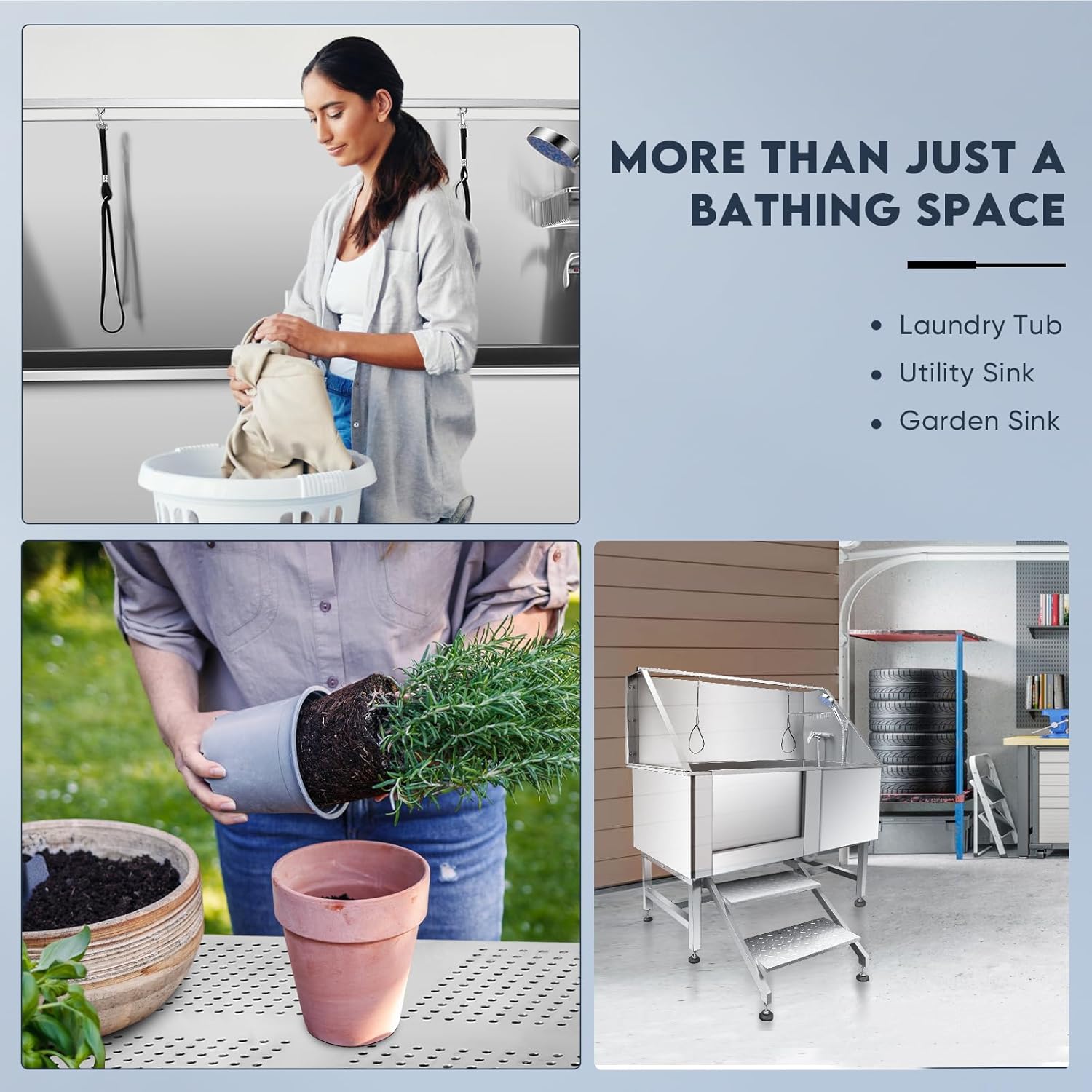 • 🐕 STURDY - The dog bath tub is made of 304 stainless steel that is high in quality. Heavy duty pet grooming sink is 62Lx28Wx42H as accommodating various sizes of dogs, especially dogs (max capacity-280lbs), and perform long-lasting use due to its high grade stainless steel material