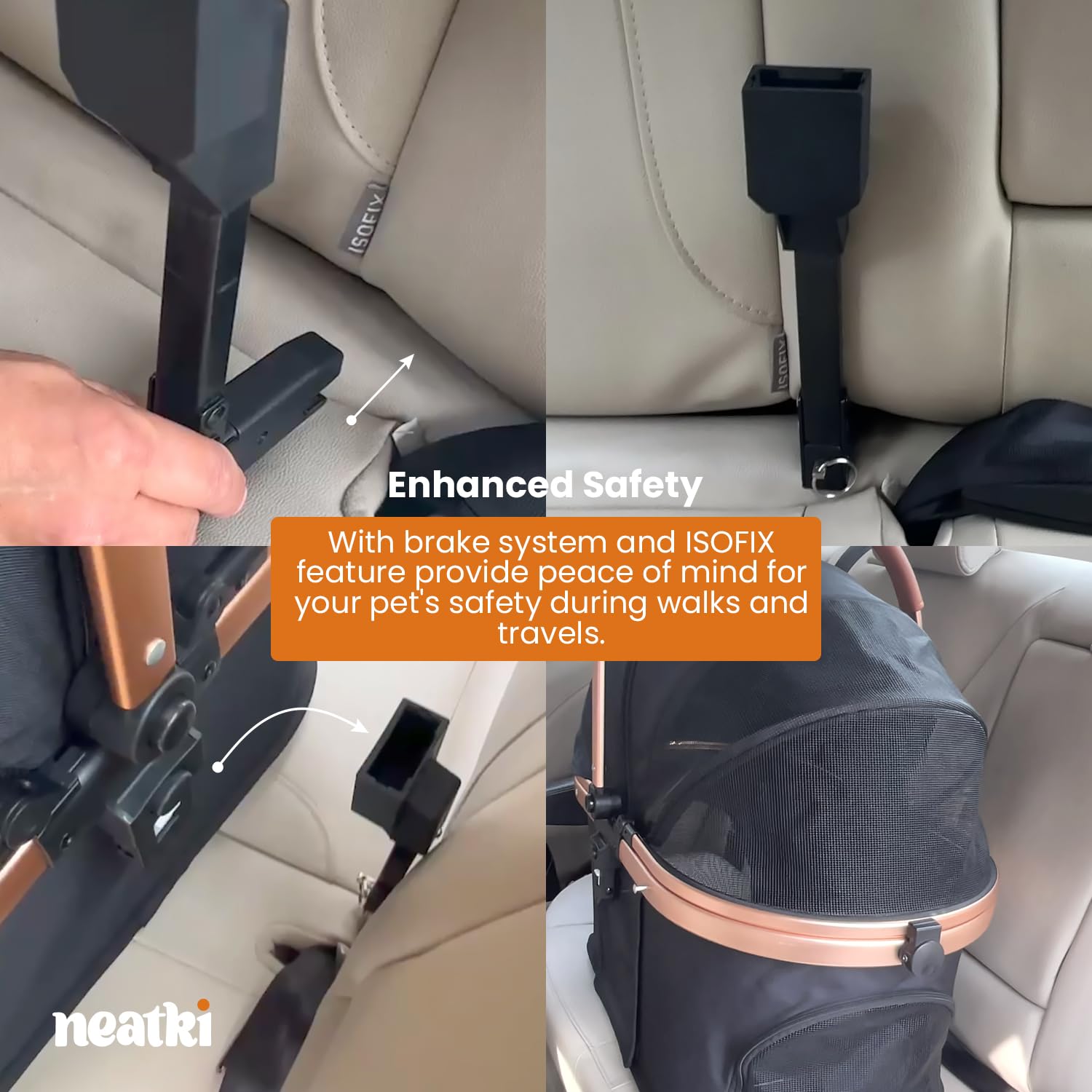 - Enhanced Safety β Equipped with a reliable brake system, this stroller keeps your pet secure and gives you peace of mind during walks and outings. Now featuring ISOFIX for easy vehicle installation, ensuring a safer, stress-free travels with your furry friend.