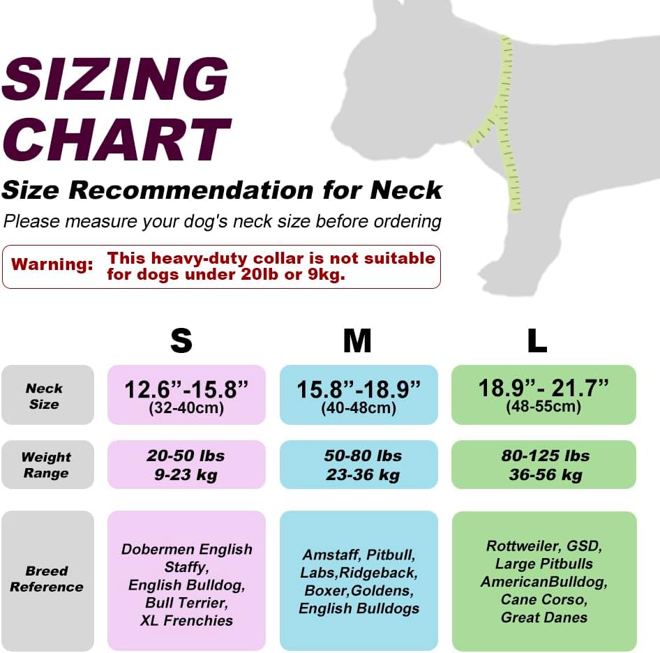 - Metal Collar for Dogs: The dog collars for medium dogs and large dogs with 4 adjustable points, easy to adjust the comfortable fit and attach to dog leash or dog collar. Please follow the size chart to measure your dog carefully before purchasing to ensure the collar is fit well to your dog. For dog neck (L: 18.9β-21.7β, M: 15.8β-18.9β, S: 12.6β-15.8β)