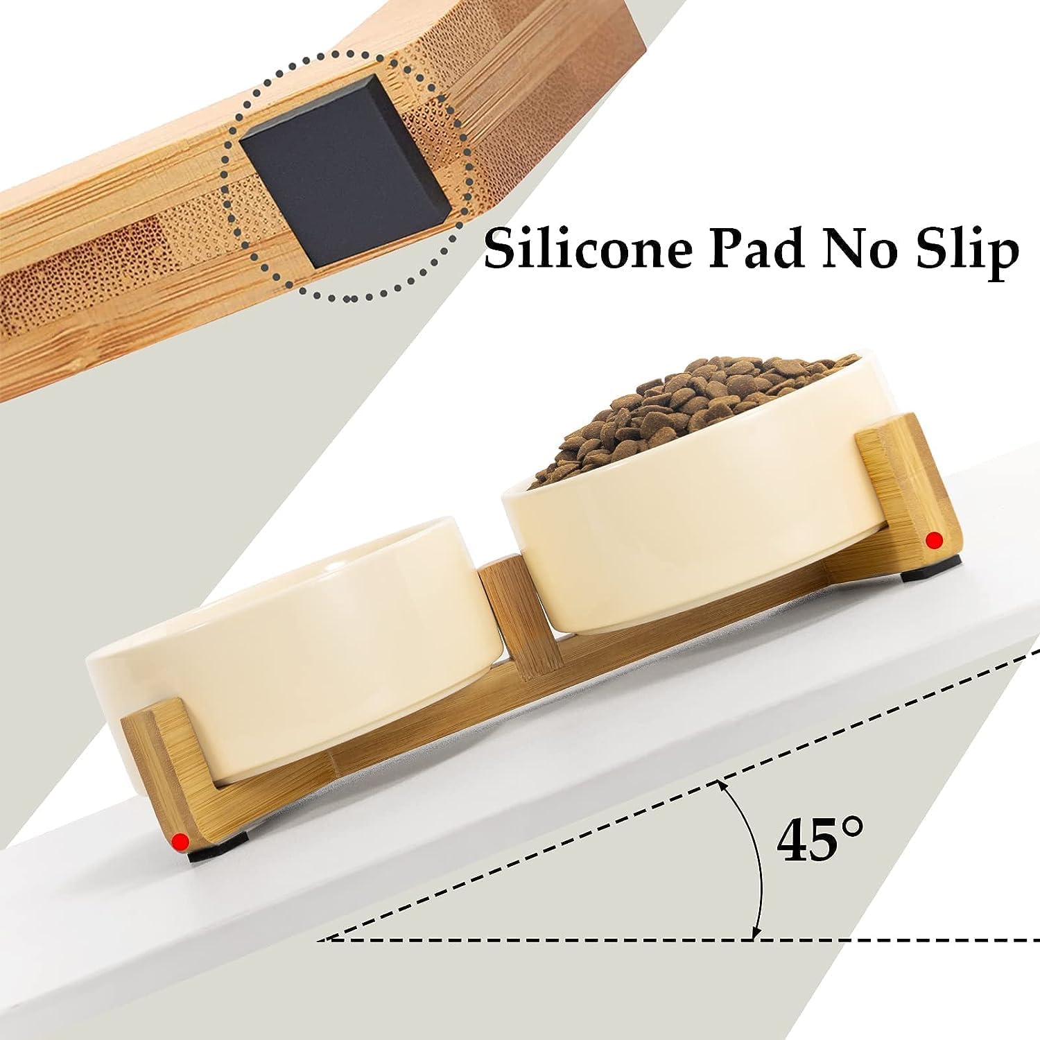 - [Double Bowl Design]:One dog bowl for food and one for water, Each ceramic cat bowl has a Unique wooden stand, raising the dishes closer to your pet for more comfortable eating