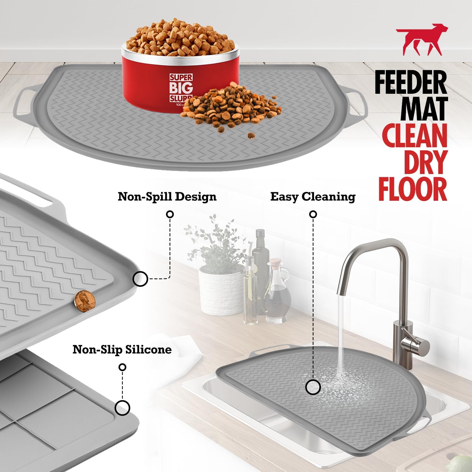 - JUMBO SIZE FOR ALL BREEDS β 26"x21" silicone mat big enough for extra large bowls, multiple bowls, gravity water dispensers, fountains and elevated feeders to contain all your dog's messy eating from ever touching the floor!