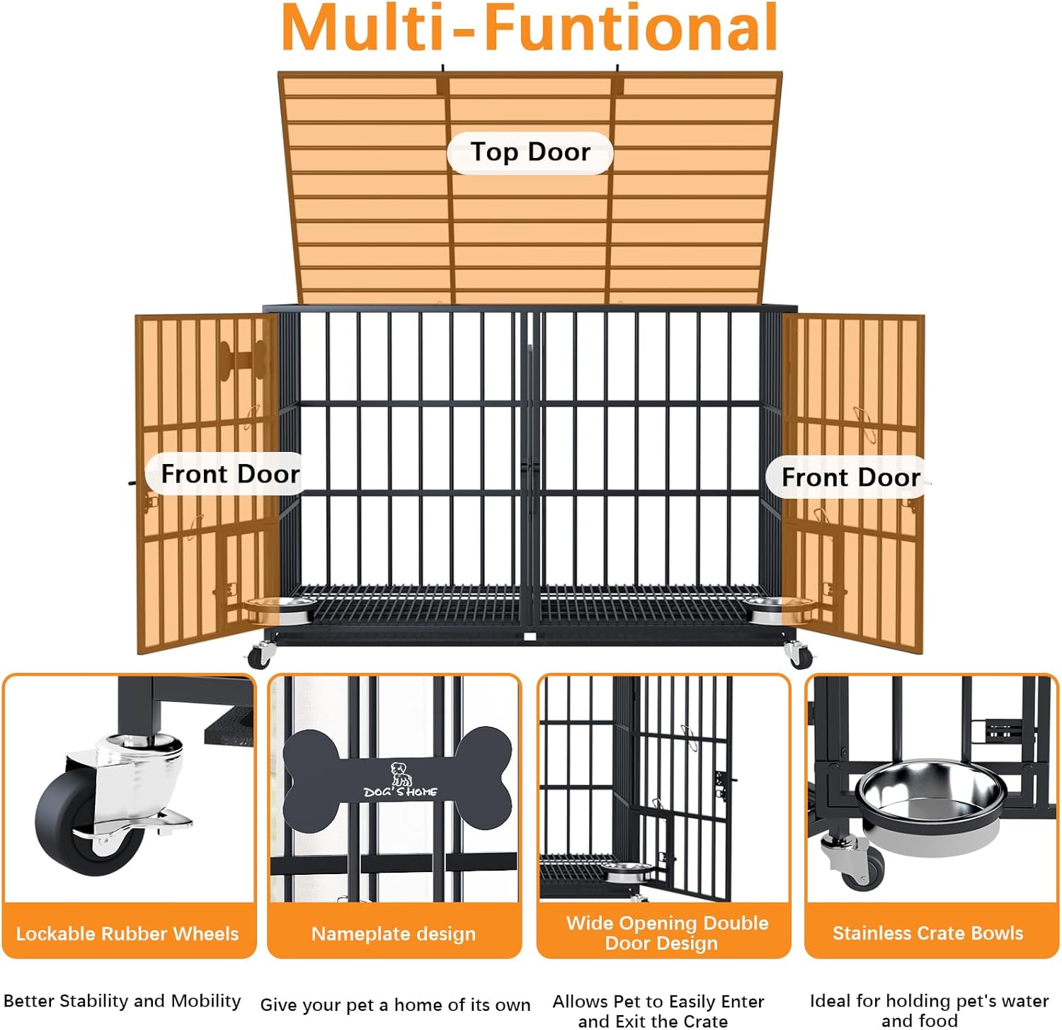 - 【Easy Access & Feeding】The dog crate has double doors and a reversible top for easy access almost anywhere. Installation usually takes only 10 minutes, including detailed instructions and installation parts.The kennel is additionally designed with 2 small feeding doors with locks.These doors allow quick and easy access to the stainless steel dog bowl, swing bowl, without having to open the front door for easy feeding. The dog kennel double door design is not only easy to get in and out of the kennel, but also good for you to interact with and feed your dog.This crate has multiple ways to open the door, so you can experiment with agility and obedience, allowing them to grow faster.