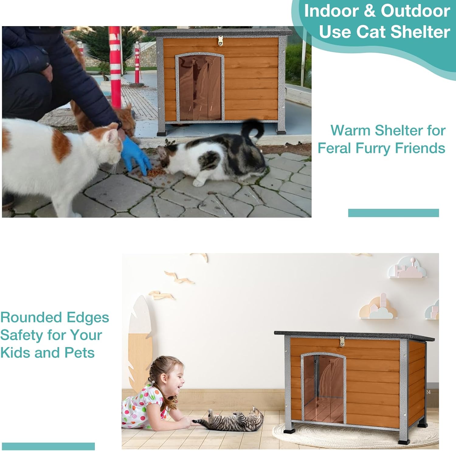 - Large Dog House Features: Cabin dog wooden house's sealed protective coating, raised floor with 4 waterproof foot pads, and weatherproof asphalt roof,PVC door curtain avoid the rain and water,Great provide comfortable and dry room for dogs.Open or lock roof help your pets bathed in the sun, the removable floor as well as convenient for owners to feed and clean.