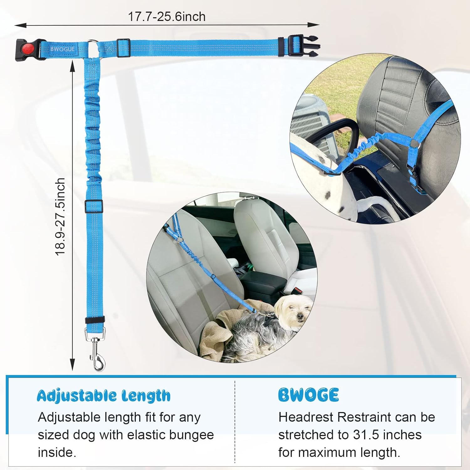 - ADJUSTABLE LENGTH: Dogs come in different sizes and weights. With buckle on the straps and the elastic bungee inside, The BWOGE Headrest Restraint is adjustable between 18.9-27.5 inches and can be stretched to 31.5 inches for the maximum length. The circle can be adjusted from 17.7 inches to 25.6 inches.You can easy to adjust the dog leash to the suitable length to keep your pet in a safety state.