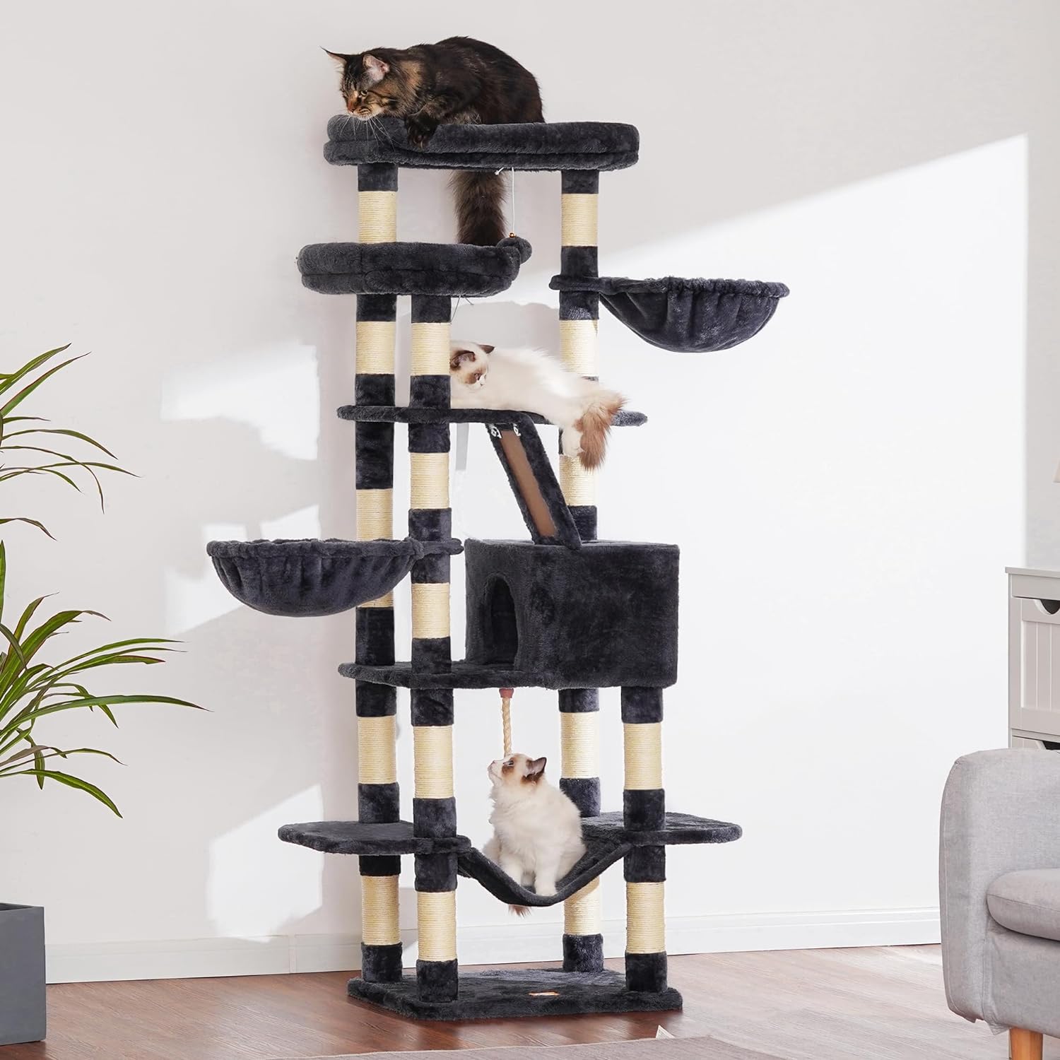 - [68" Tall, Multifunctional Design] Step-like jump multi-layer structure design of cat furniture, convenient for cat's scratching, climbing, sleeping, and exercising; The big cave,basket and hammock offer private space for catnap or hiding; Hammock to lounge and enjoy the leisure time