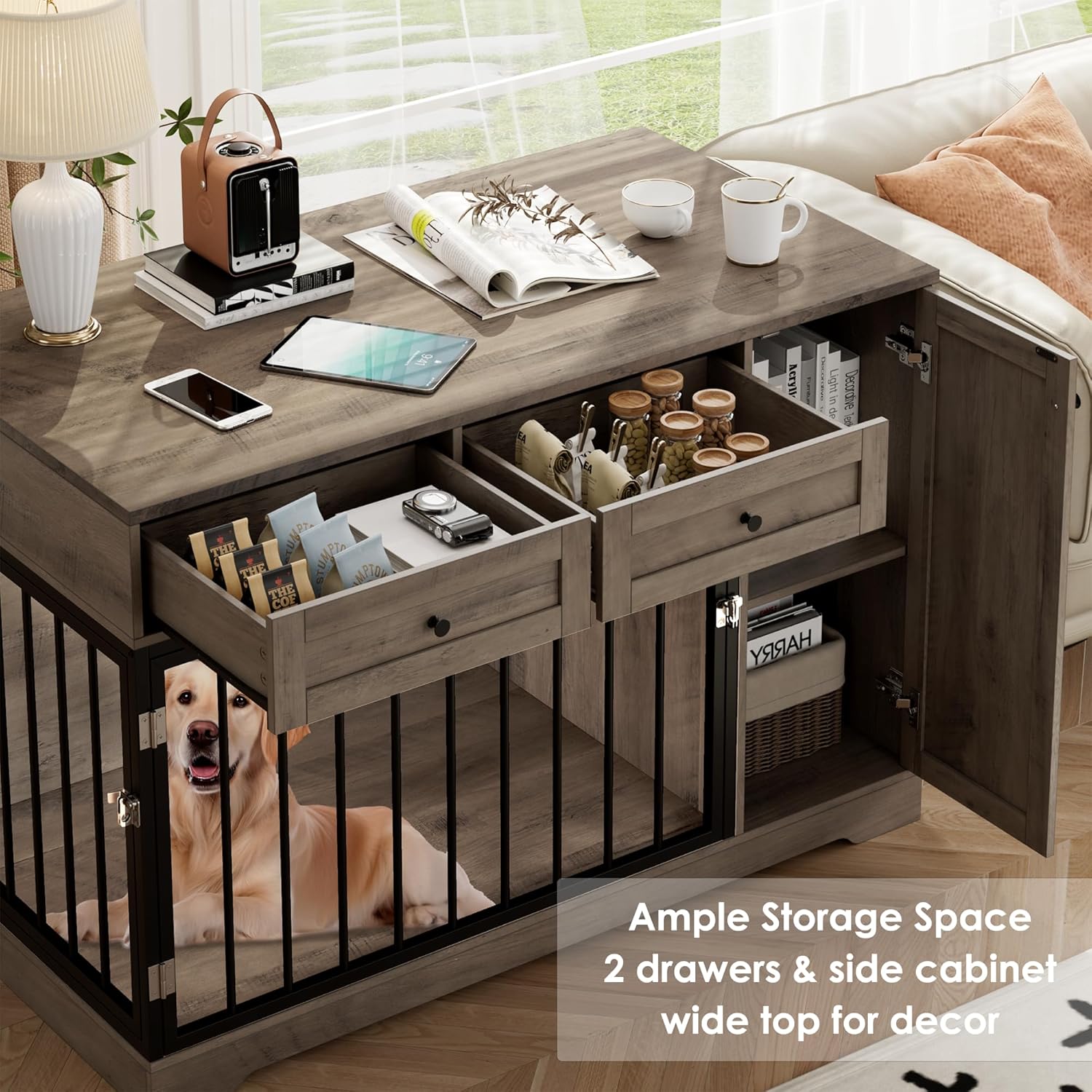 - Dog cage sideboard with storage: 47โX24โ massive table top allows to place some decorations. 2 drawers and a spacious cabinet with shelf provide extra storage space for pet items such as dog toys, snacks, food etc. This dog kennel sideboard with drawers is functioning furniture for owners of small and medium-sized dogs, who apart from the comfort of pets, also care about the interior design.