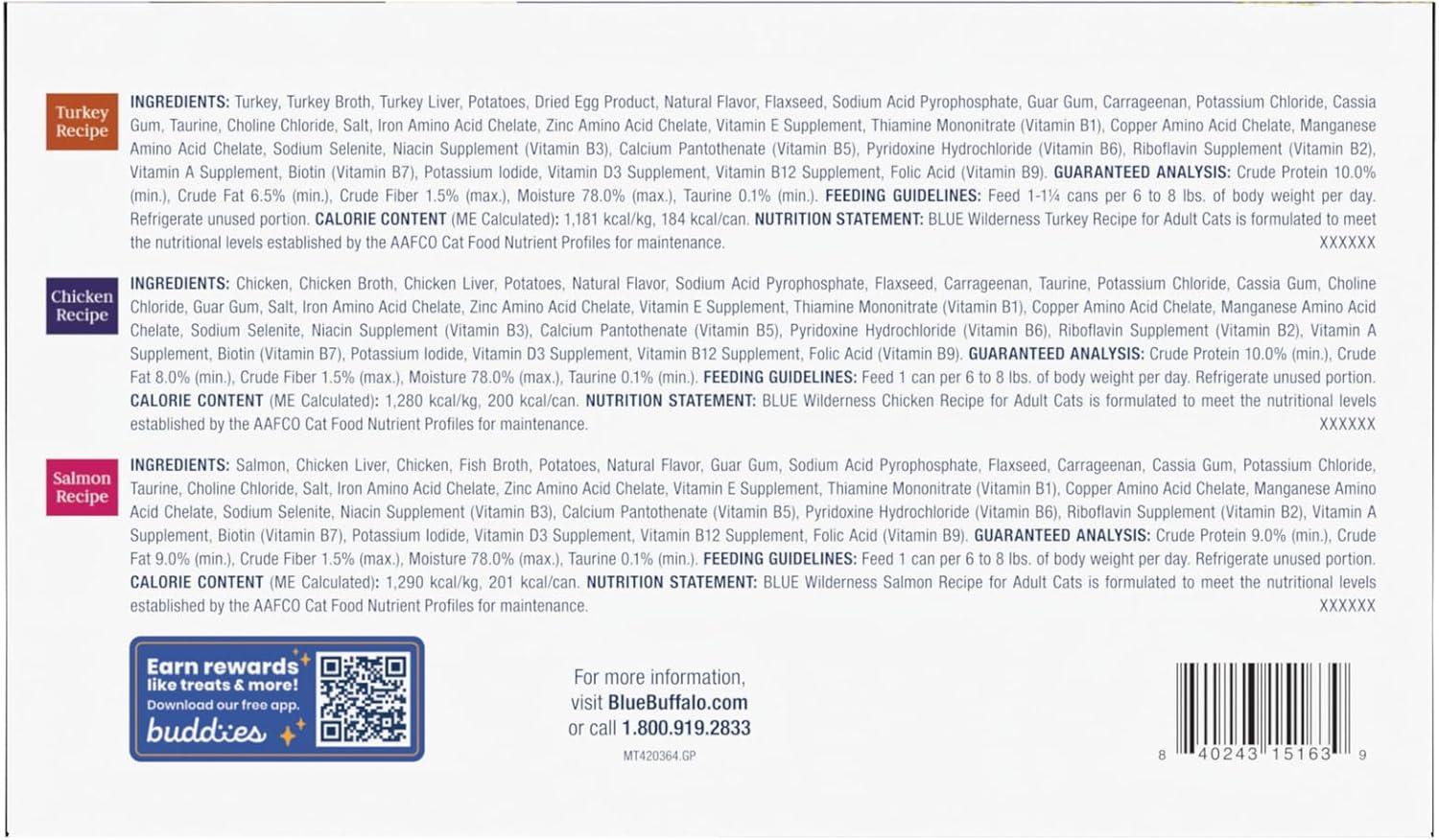 - Contains Twenty-four (24) 5.5-oz cans of BLUE Wilderness High Protein, Natural Adult Pate Wet Cat Food, Chicken, Salmon, Turkey