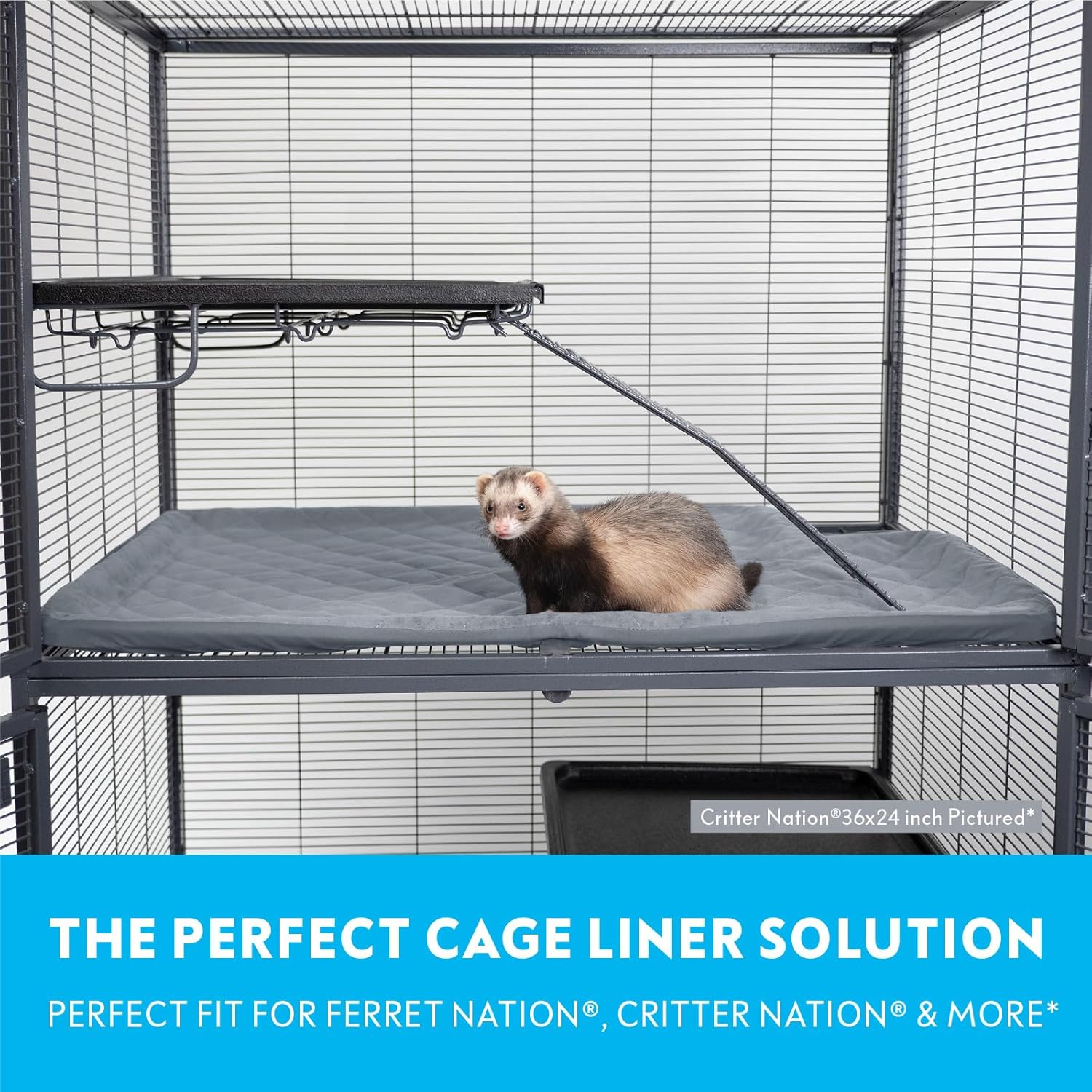 - PERFECT FIT: Designed specially for use with the top pan of the Ferret Nation and Critter Nation* cages and includes a cut-out for the ramp opening. A stretchy elastic bottom band makes the liner easy to put on and secure over the pan, and a flexible wide strap reinforces the liner for a perfectly tight fit.