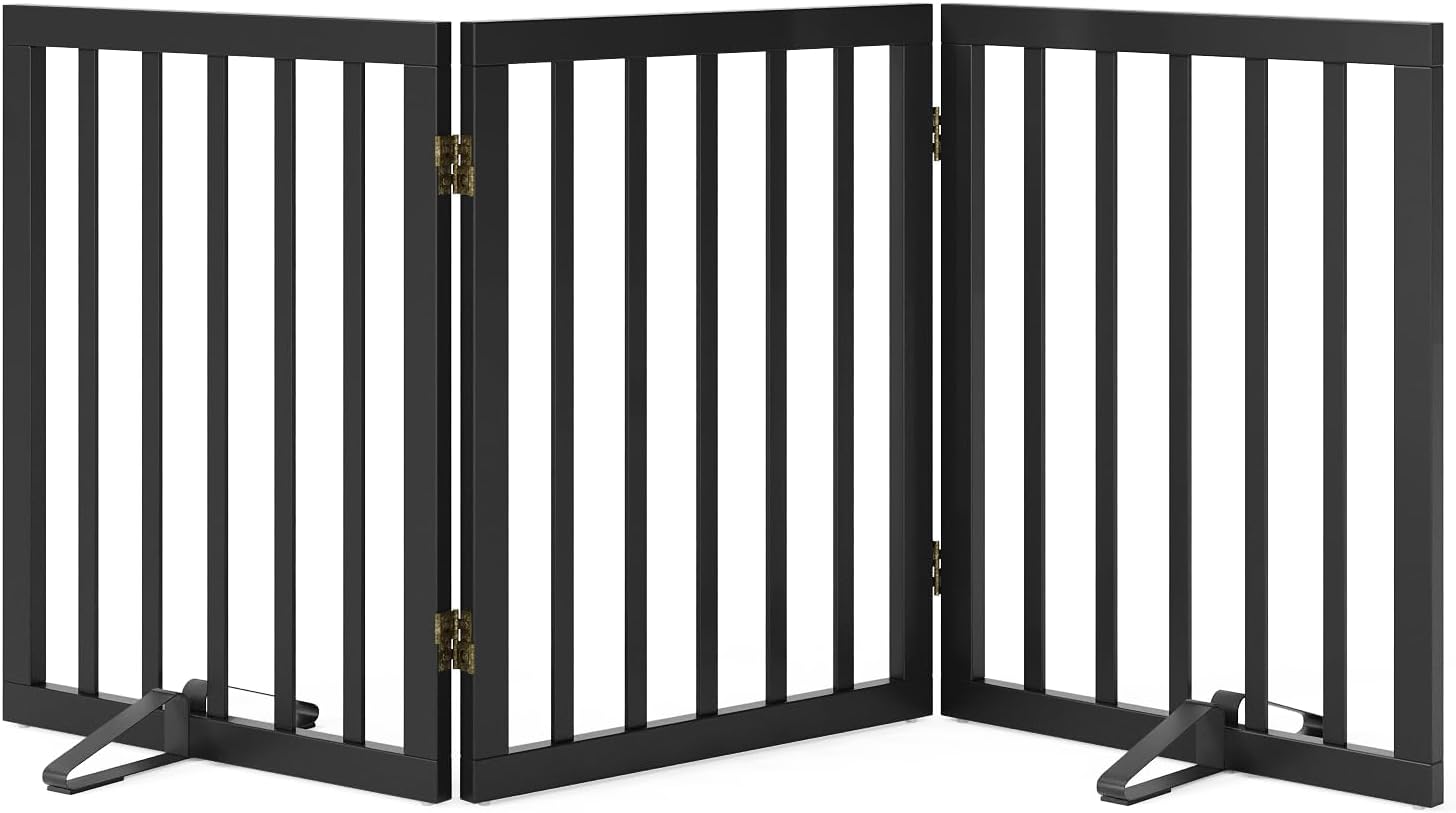 - Foldable Pet Gate: This pet gate is stand alone, no-drill, and features a 360-degree hinge design that allows you to fold it into a wide z shape or temporarily enclose it into a square fence. The wide slats of freestanding doggie gate for indoors provide a secure barrier without making your pet feel like they are completely isolated from your home