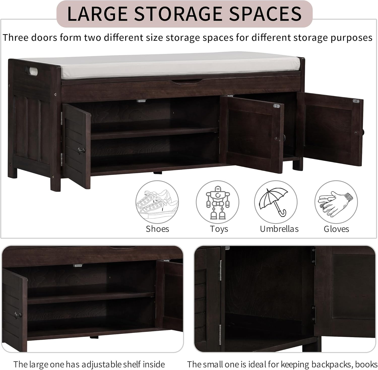 - Large Storage Spaces: Three doors form two different size storage spaces for different storage purposes. The large one has adjustable shelf inside that can be adjusted to three heights as well or users can remove it if need. The small one is ideal for keeping backpacks, books.