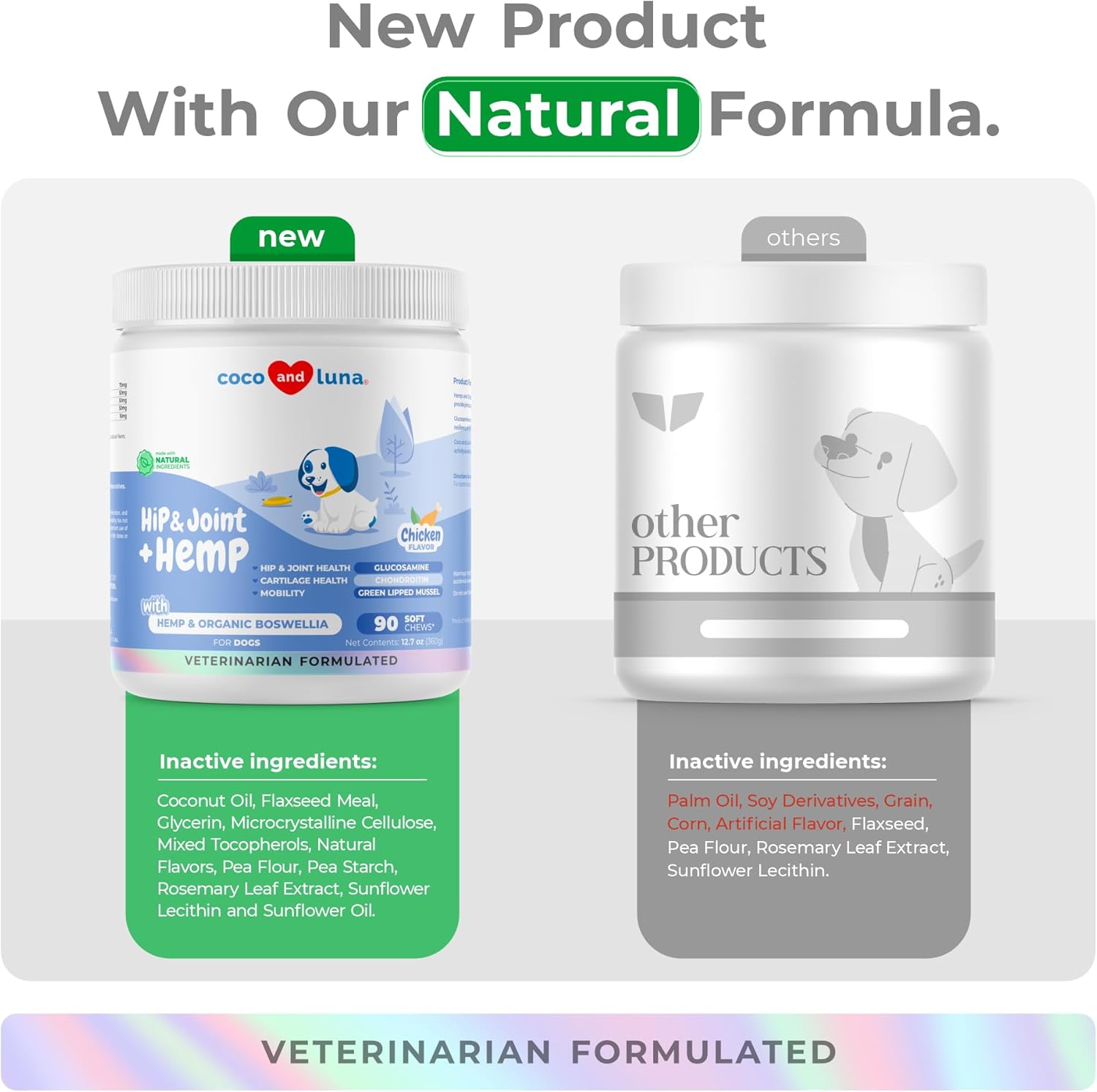 Hemp Hip and Joint Supplement for Dogs - 90 Soft Chews - with Green Lipped Mussel, Glucosamine, Turmeric, Fish Oil, MSM and Yucca Schidigera