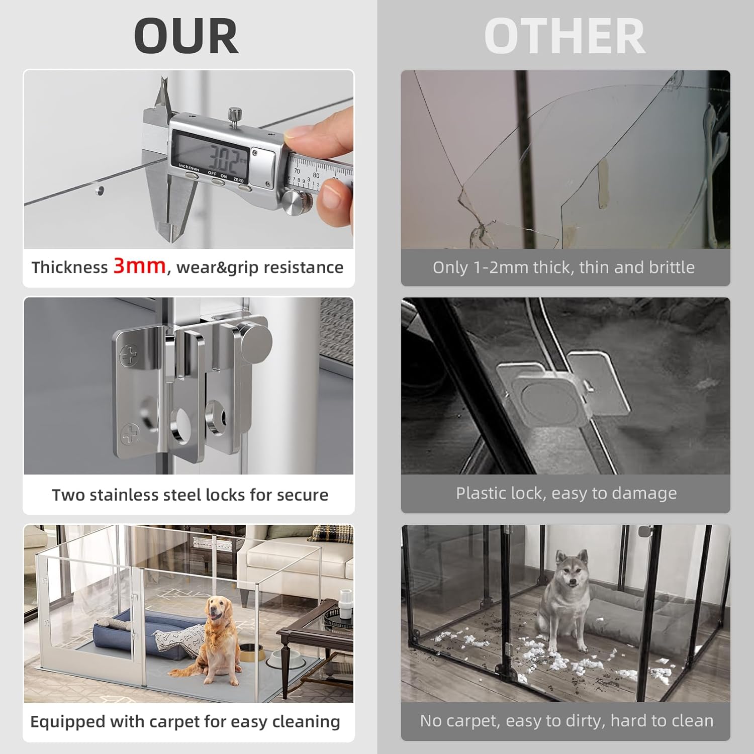 - Clear Acrylic Fence Design - Crystal-clear acrylic dog fence playpen enables you can interact with your pets closely, 360° high transparency and wide vision, it’ll relieve your pets from anxiety, they also make sure you are by their side, equipped with a door for dog mom/ pets to come and go easily, so this is a unique gift for your loved friends, get this fence in the room, instantly improve the overall interiors