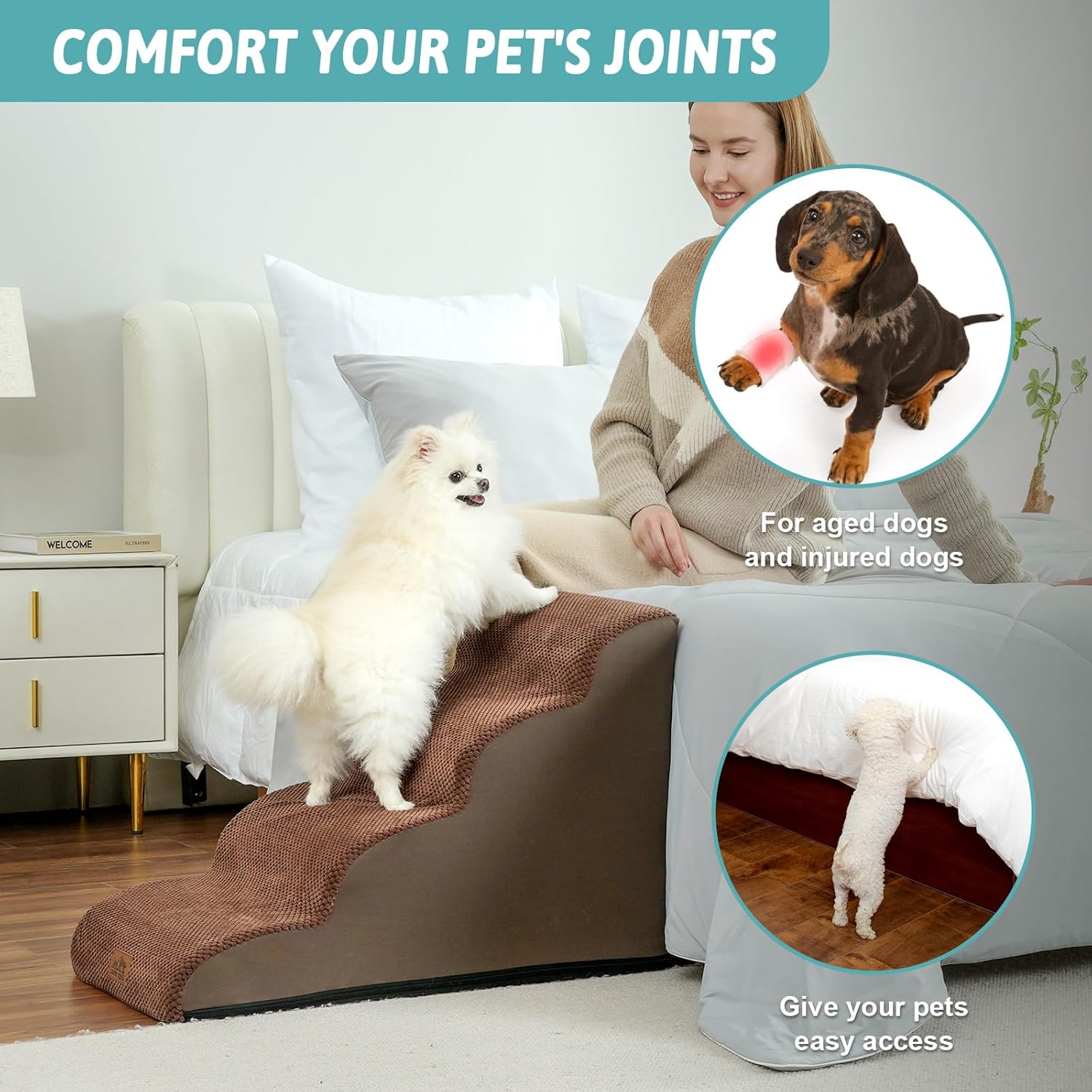 - DOG STAIRS FOR SMALL DOG: The soft and comfortable curved ramp design is more suitable for puppies and pets with knee injuries. Note: This pet stair is suitable for small and medium-sized dogs. Dog stairs are designed to lean against the edge of a bed, sofa or other furniture. Due to vacuum compression, it takes 24-48 hours to return to its original shape. There are wrinkles when opening the packaging, which is the result of long-term compression. You can iron it to keep it flat