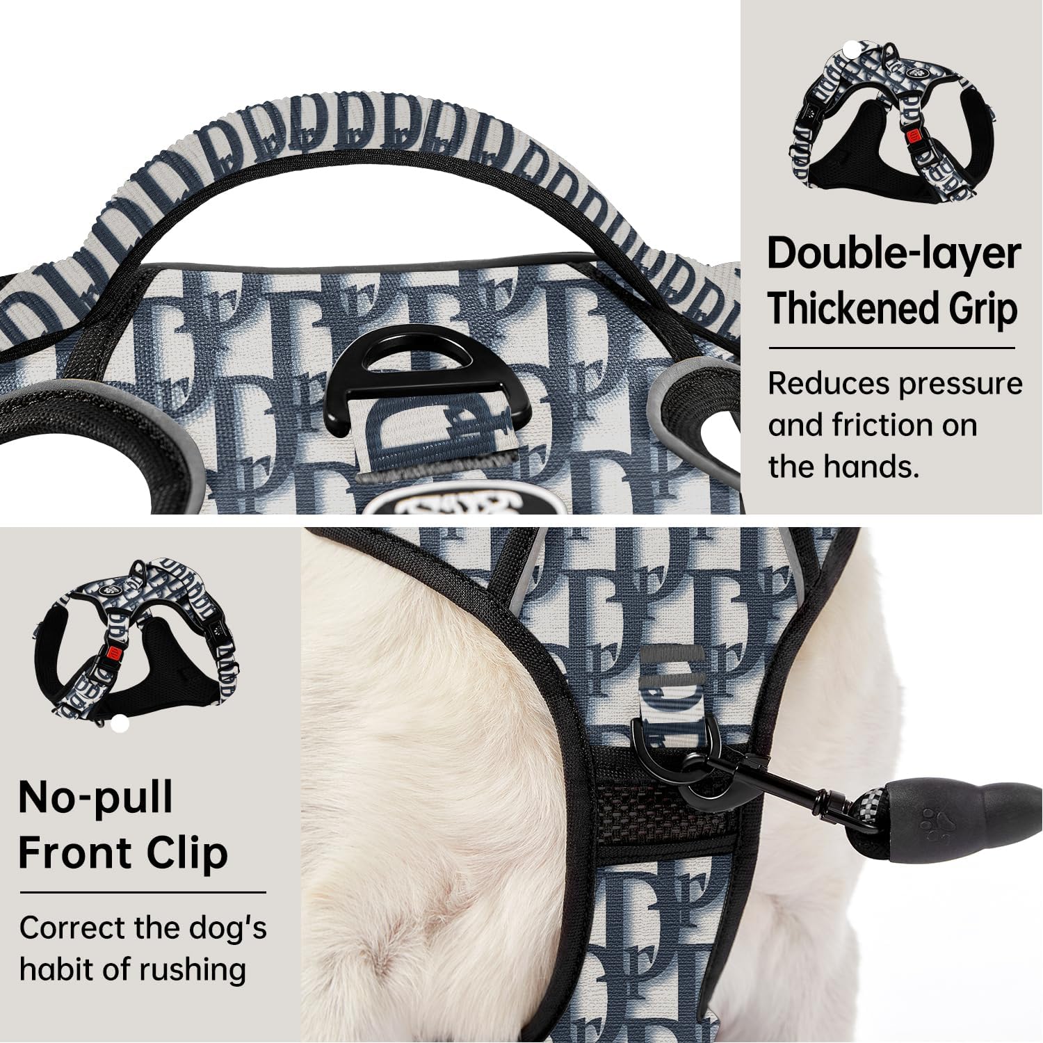 • ≡ FRONT & BACK CLIPS ≡By limiting the dog's walking direction, using the front clip will stop the dog from pulling(of course, you can also hang the dog tag on it) . Both 2 clips are made of alloy material with one-piece molding process. The connection between the clips and the fabric has also been strengthened in multiple ways to ensure that the dog will not get out of control
