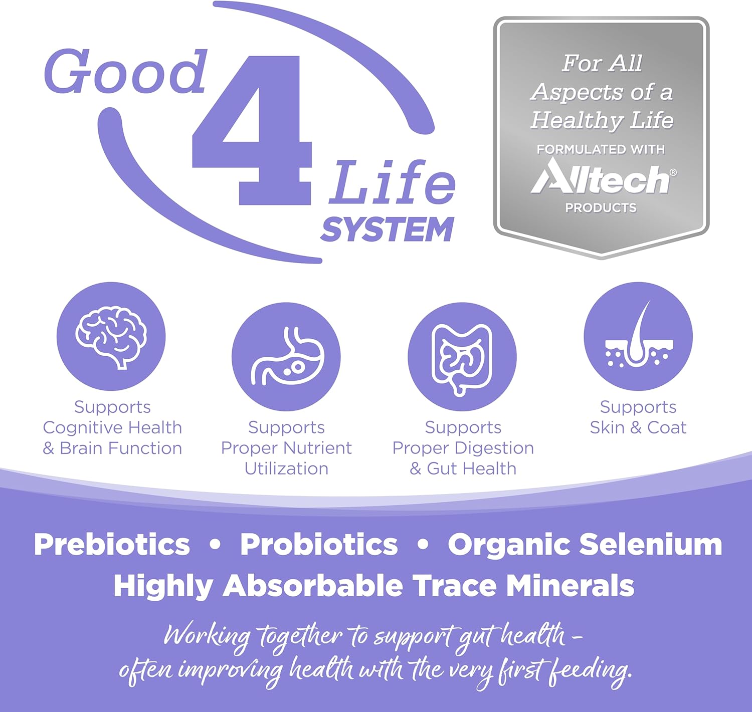 - Our proprietary Good 4 Life+ system includes 4 key ingredients that work together to support gut health and the overall well-being of your pet plus the inclusion of NVGEN for high animal protein diets.