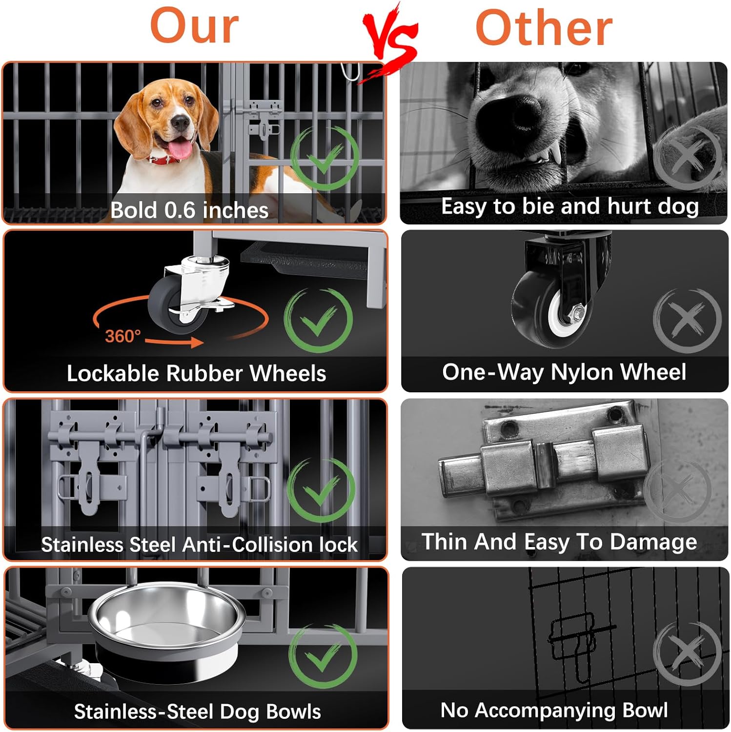 - ăPractical & Easy to Move and CleanăThe dog crate comes with four smooth rolling locking wheels for easy movement and fixation, you can easily move the crate to different positions as needed. The dog crate comes with a pull-out tray for easy removal and cleaning. It also comes with a safety latch to avoid your smart dog from opening the iron door, effectively protect your pet.