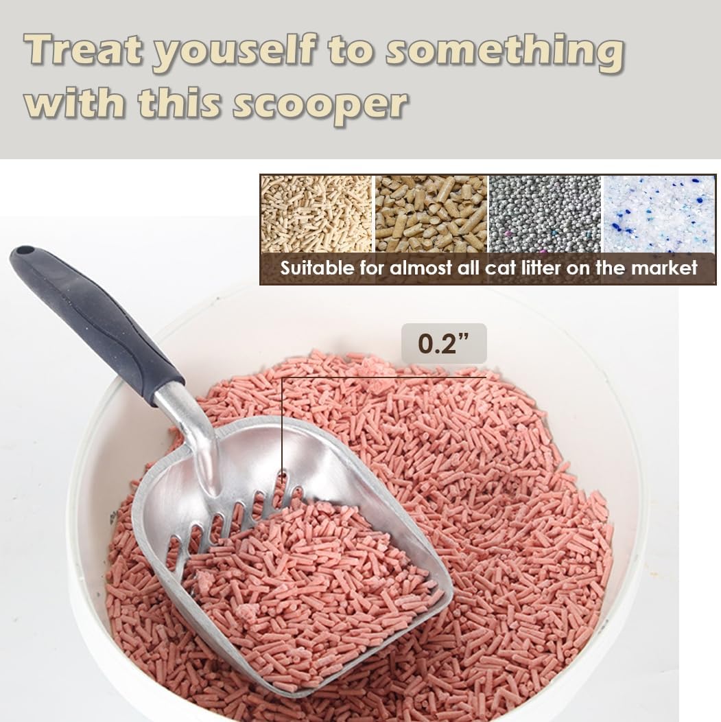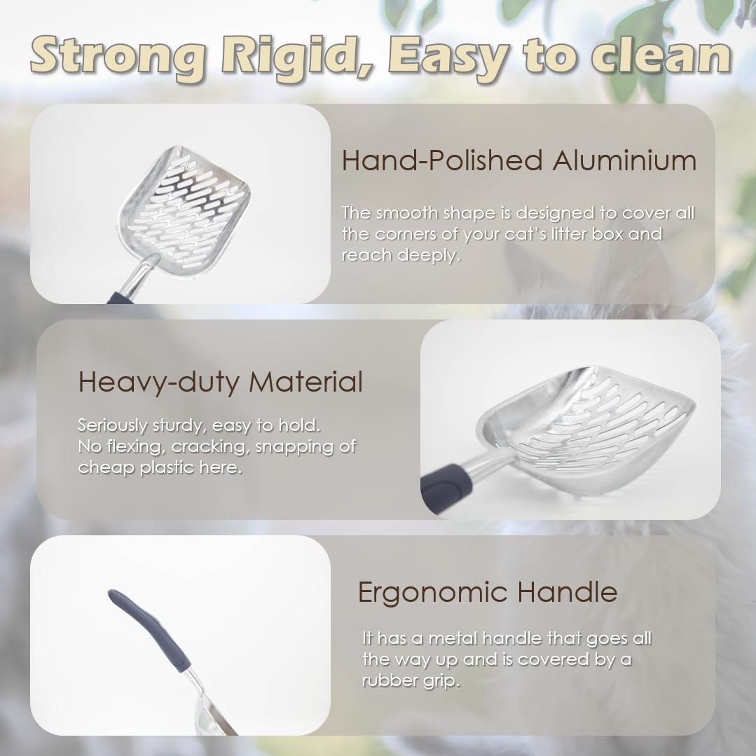 - HAND-POLISHED ALUMINIUM - The bigger scoop lets you pick up more at one time & holes are big enough to sift the clean litter out easily. If you do have stuck clumps, the sharp edge & sturdiness of the scoop clean them right of the sides & bottom