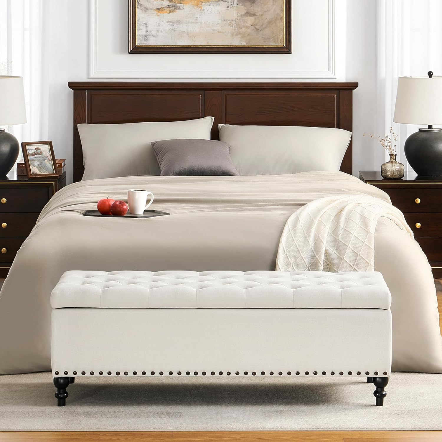 - VERSATIAL USES:Featuring a vintage design, this storage bench is available in three styles - riveted, with pull tabs, or with a tray - and whether it's used as a cozy end-of-bed bench in the bedroom, a footstool in the living room, a shoe bench in the hallway, or an upholstered bench with storage in the closet, it will meet all of your needs as well as serve as a beautifying decorative feature.