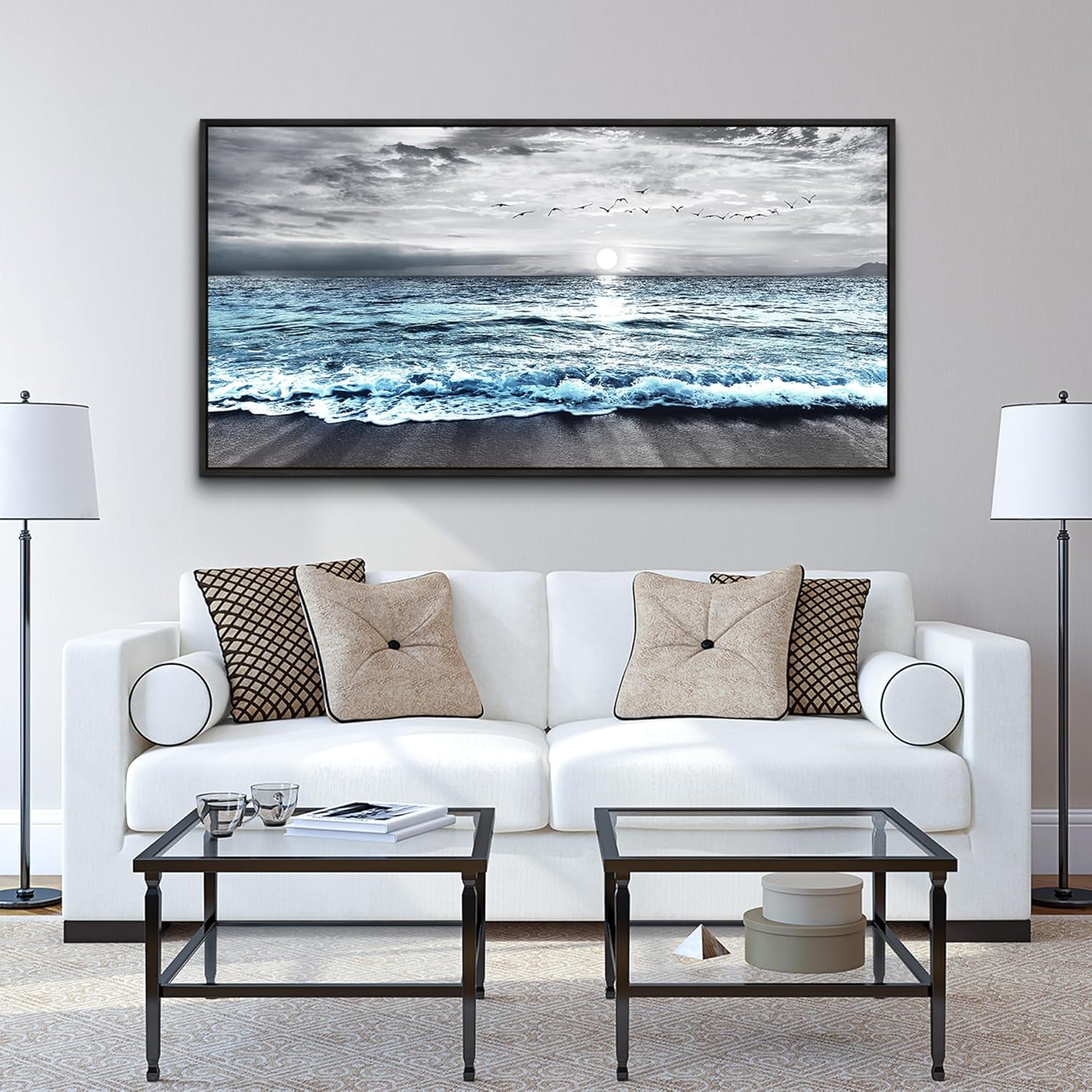 Wapluam Large Black Framed Wall Art For Living Room Wall Decor For Bedroom Office Wall Decorations Black And White Wall Painting Blue Sea Wave Pictures Artwork For Modern Beach Canvas Prints Poster