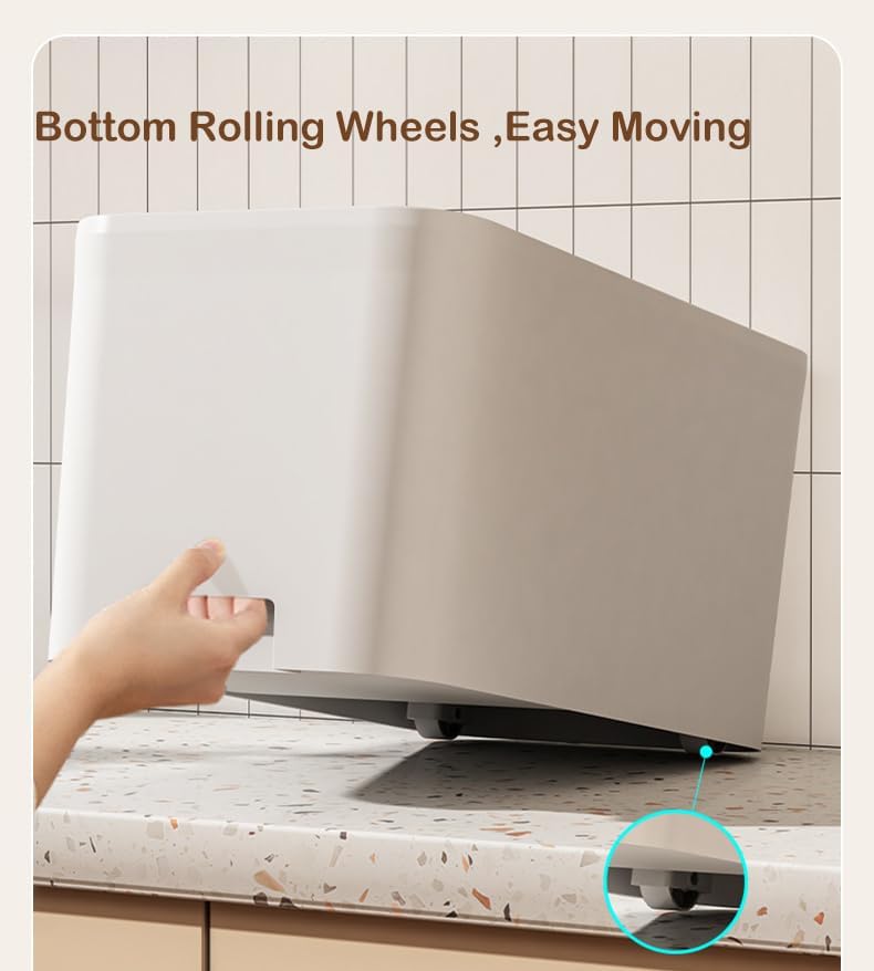 - 【Moveable pet food bin with Wheels】:The 4 detachable rolling wheels make it easier to move around the container even when it's full, and it lifts the dog food bin up to aviod the moisture from floor.