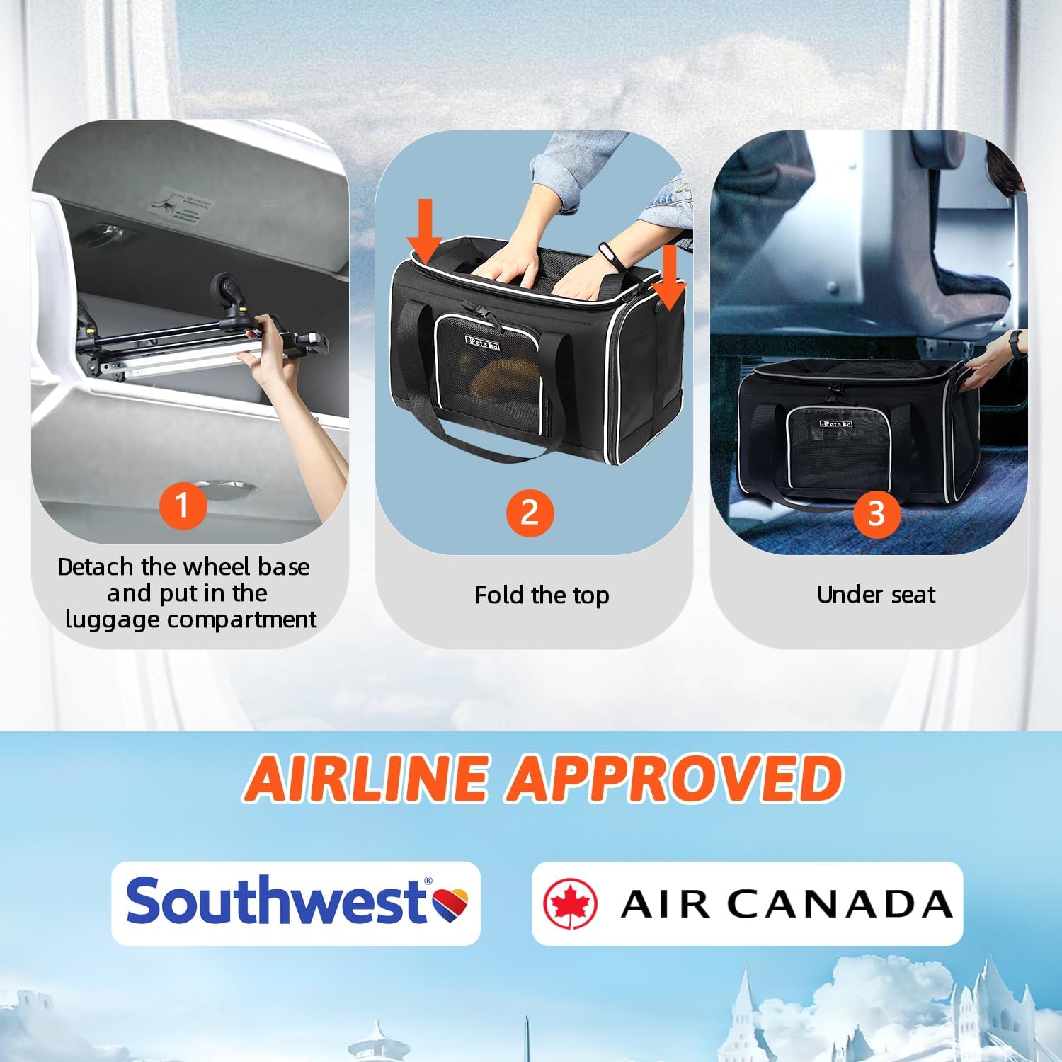 - 【AIRLINE APPROVED CARRIER 】Unfolded size:18"L×13"W×(9.5+3.5)"H, Petskd pet carrier is TSA approved and can be placed under the seat in the cabin(after remove the wheel base), it is mainly designed for ①Southwest Airlines, but also in compliance with ②Air Canada". We recommend you buy this carrier when you fly with the above-mentioned airlines.