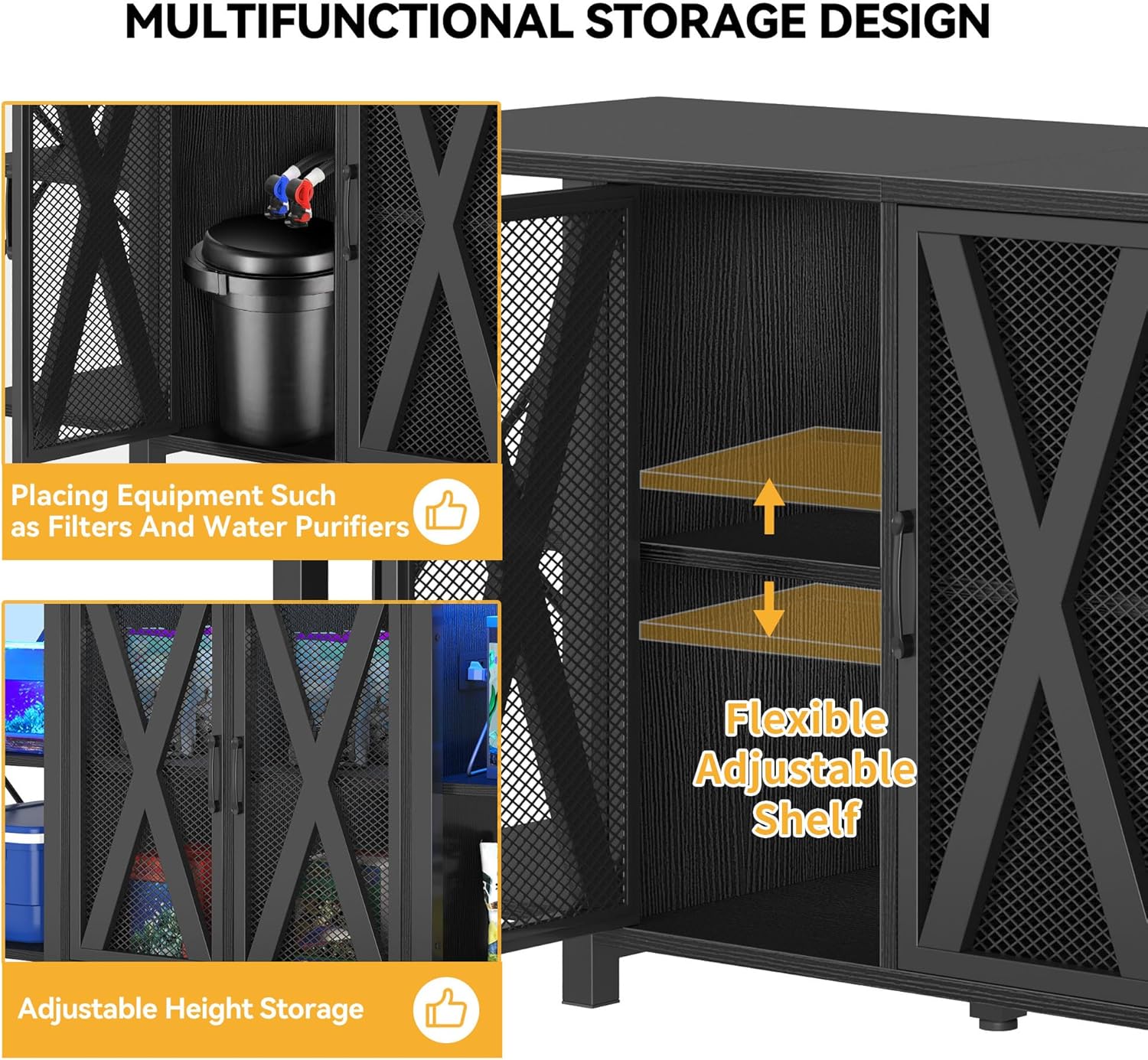 • Orderly storage: This fish tank with stand easily keeps everything organized. The built-in cabinet stores fish food, cleaning tools, and other accessories while the adjustable shelves help accommodate items of various sizes