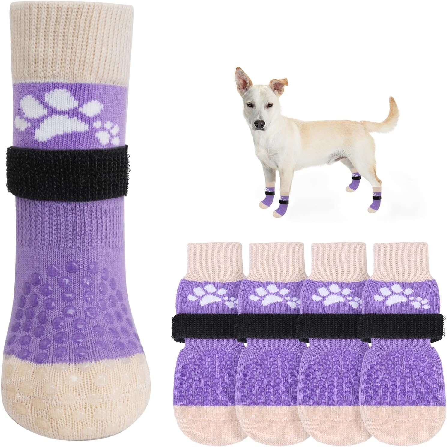 - COMFORTABLE AND BREATHABLE CUTE DOG SOCKS: Made of soft and elastic fabric, perfect fit for your dog's feet, breathable and not stuffy, and thicker than general dog grip socks, more wear-resistant. White double paw jacquard design at the top center of the front and back, cute and fashionable.