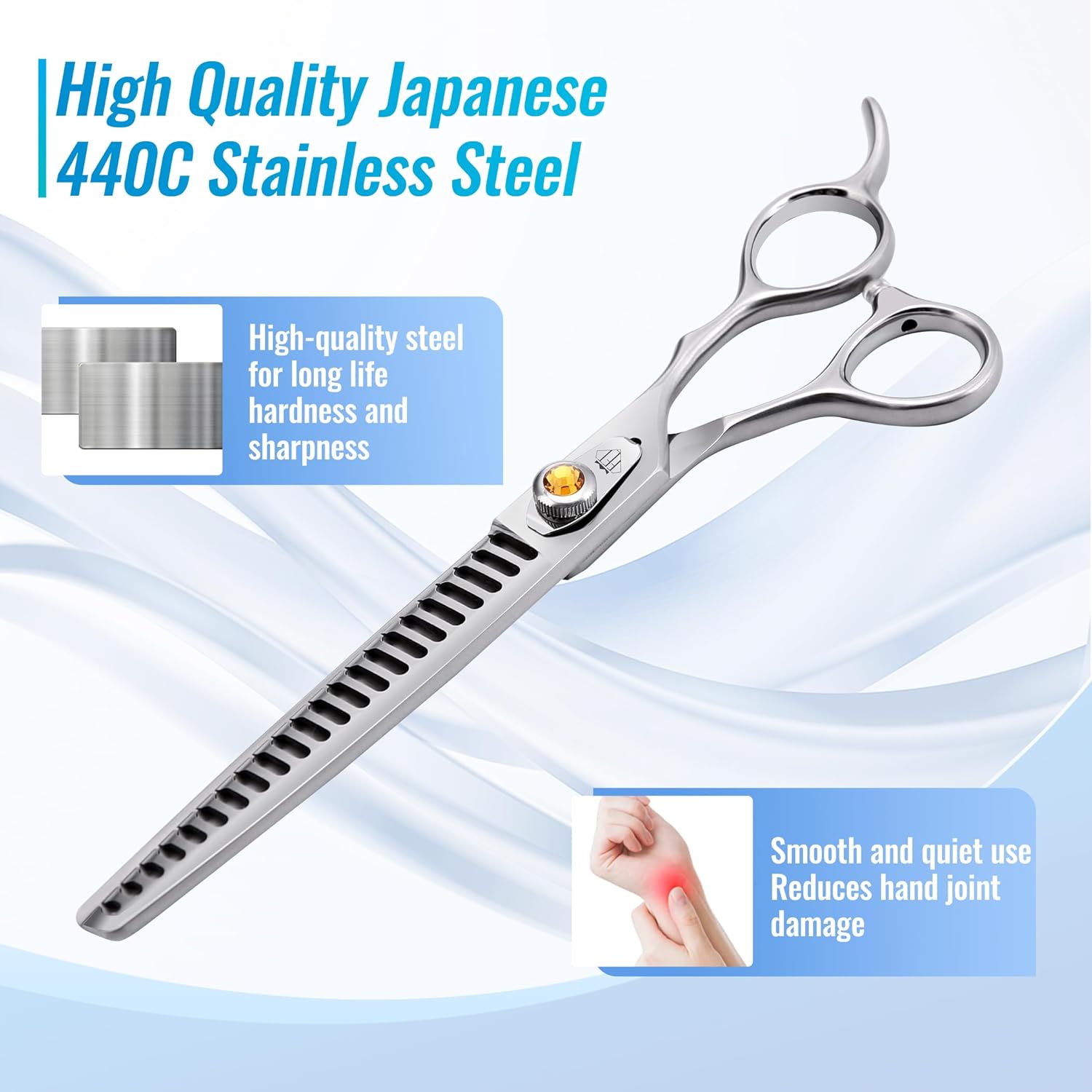 - Features: These pet chunker scissors are 7.5 inches long with ergonomic handles that fit most people. Fine polished brushed surface with delicate metal texture. Precise adjustable screws effectively prevent the screws from loosening due to prolonged use.