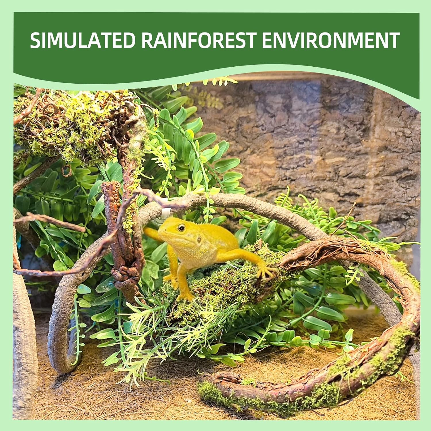 • 【Safe Material】 The reptile plants are made of non-toxic polyethylene plastic, man-made glass container plant decorations, safe and durable. The surface of the jungle vine is covered with artificial moss for a natural feel. The stems inside the vines are made of wire and can be bent into the shape you want. Please do not bend it quickly or the plastic shell will break.