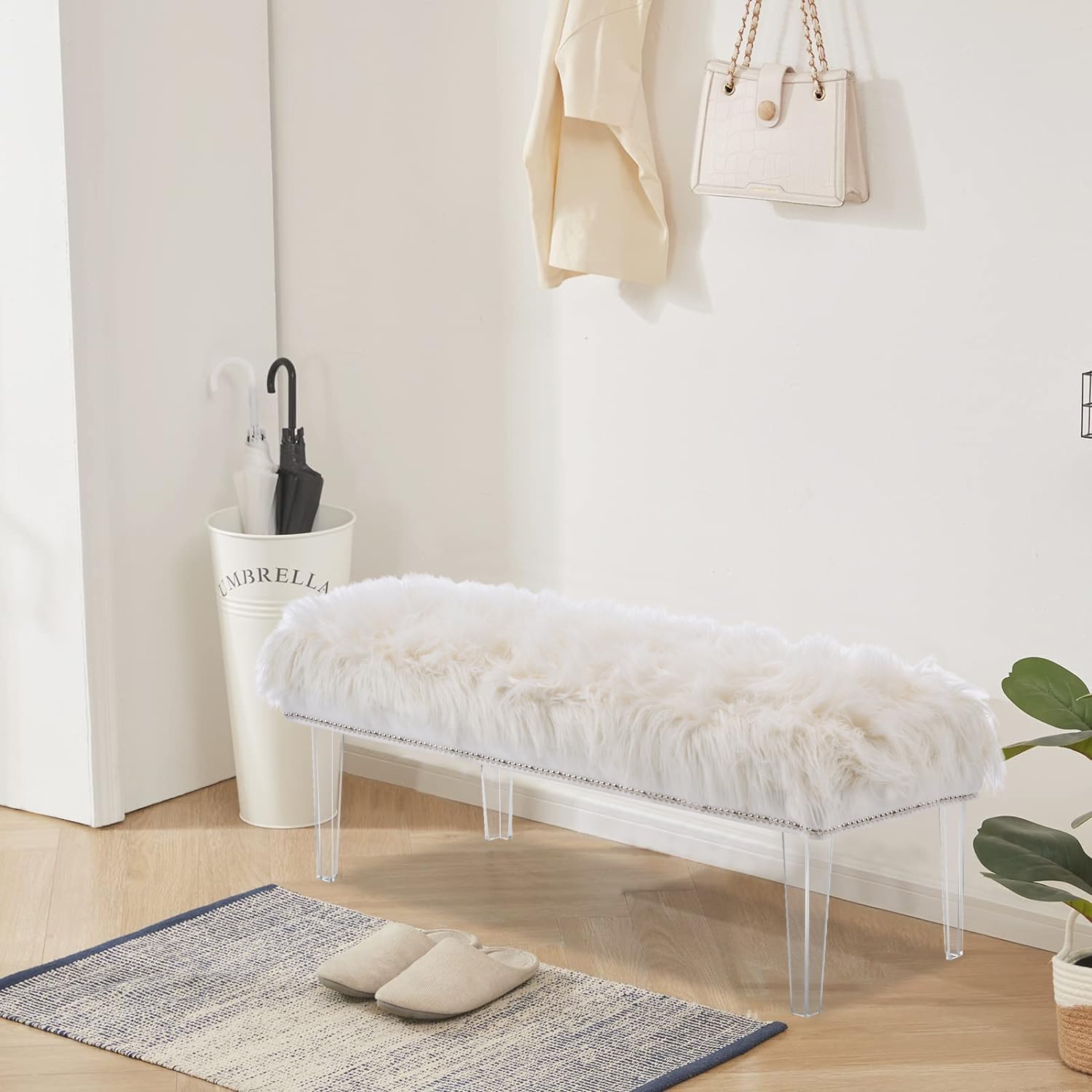 46 Inch White Bedroom Bench, Benches for Bedroom White Faux Fur Upholstered Bed end Bench, Tufting Ottoman Bench Indoor Bench with Acrylic Legs for Living Room Bedroom Entryway