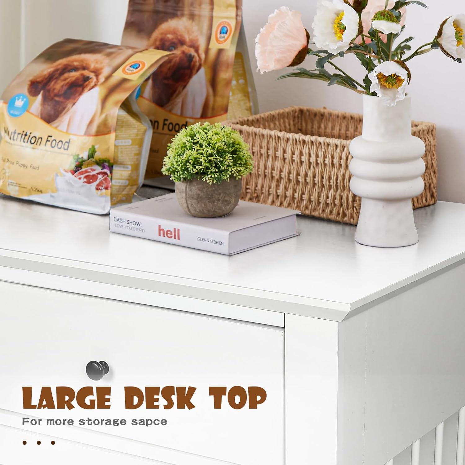 - Large Table Top & Storage Drawer: The top panel of the dog cage is large and sturdy, and can hold up to 150 lbs, perfect for displaying home decorations such as plants, magazines, and family photo frames. And below the countertop are two large drawers, you can store dog food, snacks, toys, etc. Under the drawers is the exclusive space for the dog
