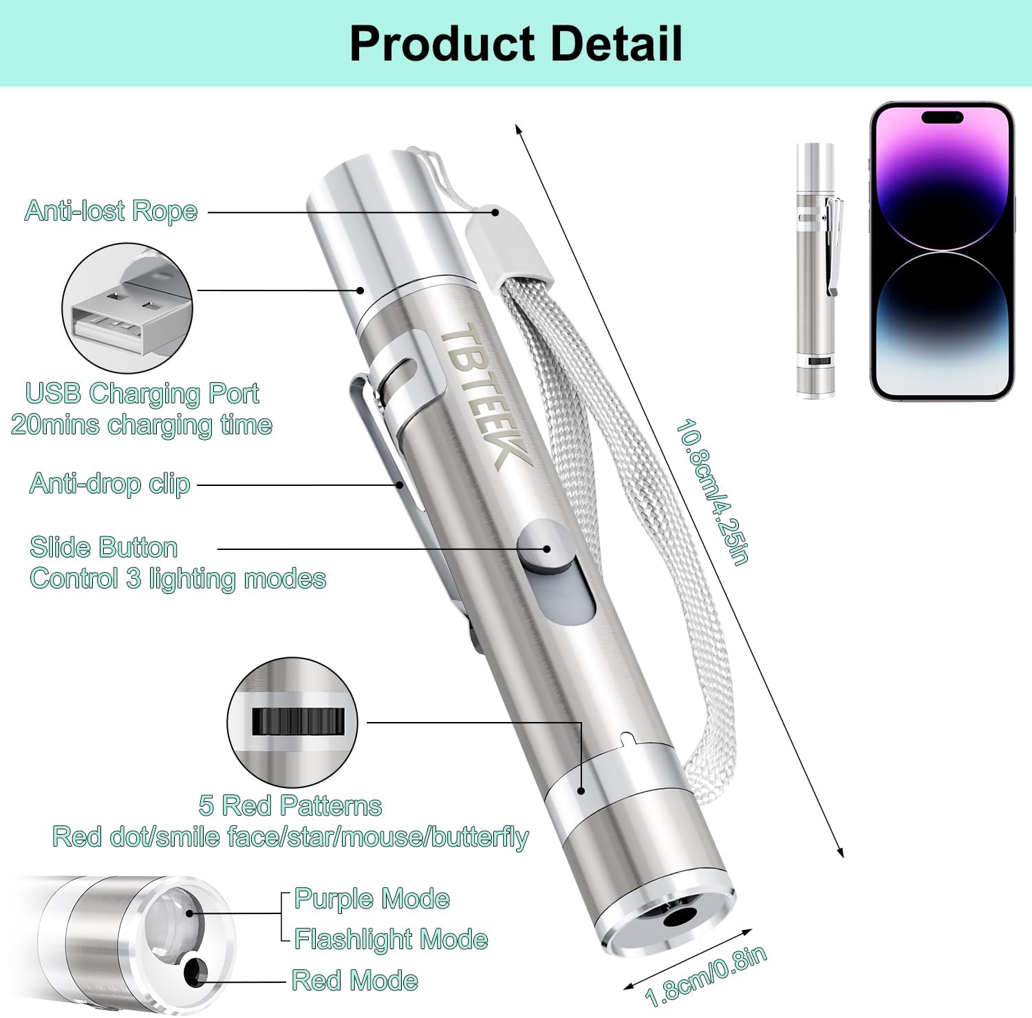 • 7 in 1 Modes: Scroll the gear to pick 5 red patterns(dots, smiles, mouse, stars, butterflies). The variety of patterns sparks pet's interest, enhancing your and cats' interaction. 3 lighting modes can be adjusted, red for cat playing, purple for checking cat skin health /money, white for mini flashlight