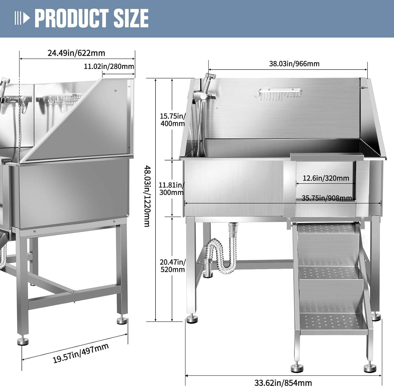 38"" Pet Dog Bathing Station W/Ramp, Professional Stainless Steel Dog Grooming Tub W/Soap Box, Faucet,Rich Accessory, Dog Bathtub for Large,Medium,Small Pets, Washing Sink for Home,R-RAMP