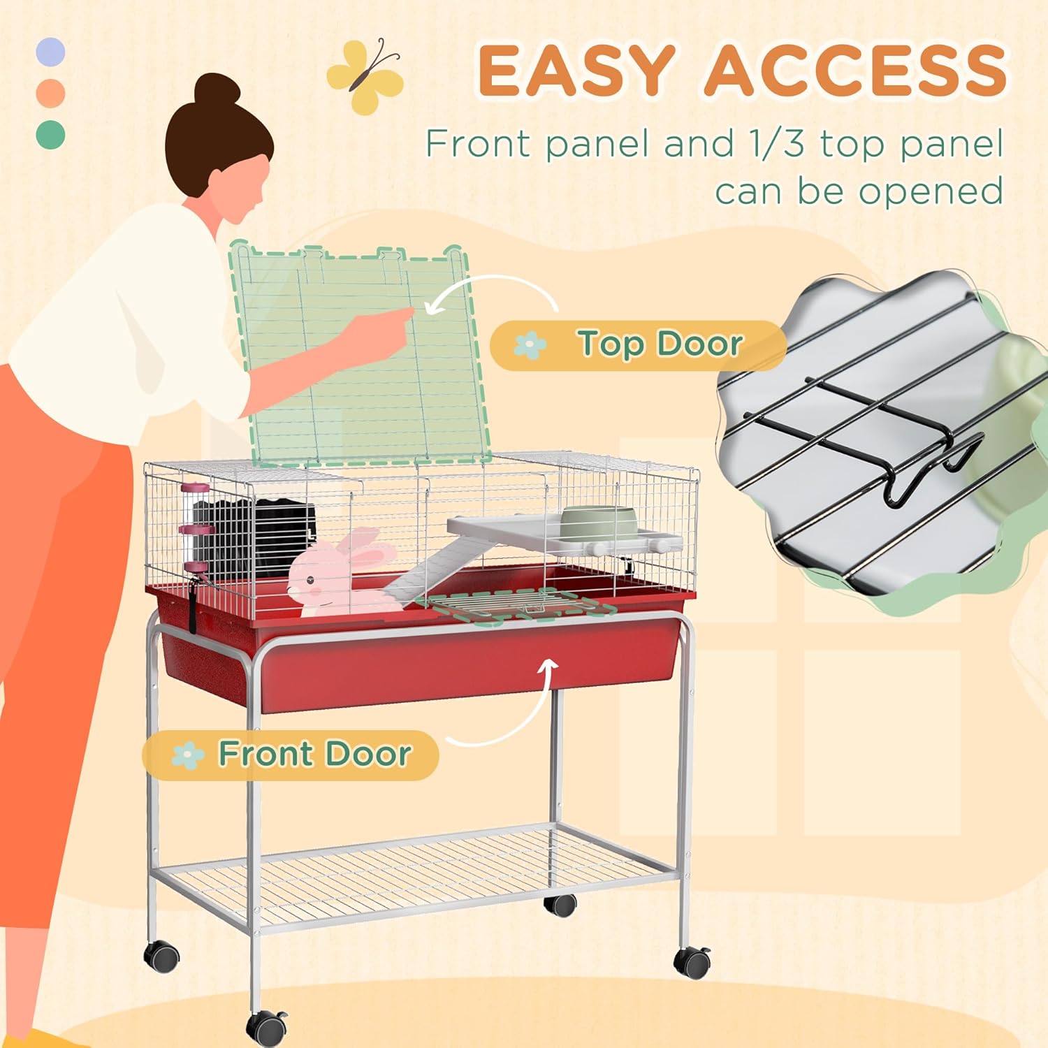 - Elevated Platform & Pet Accessories: This pet cage comes with an elevated platform to create a private space underneath. A food dish, hay feeder, and water bottle are included.