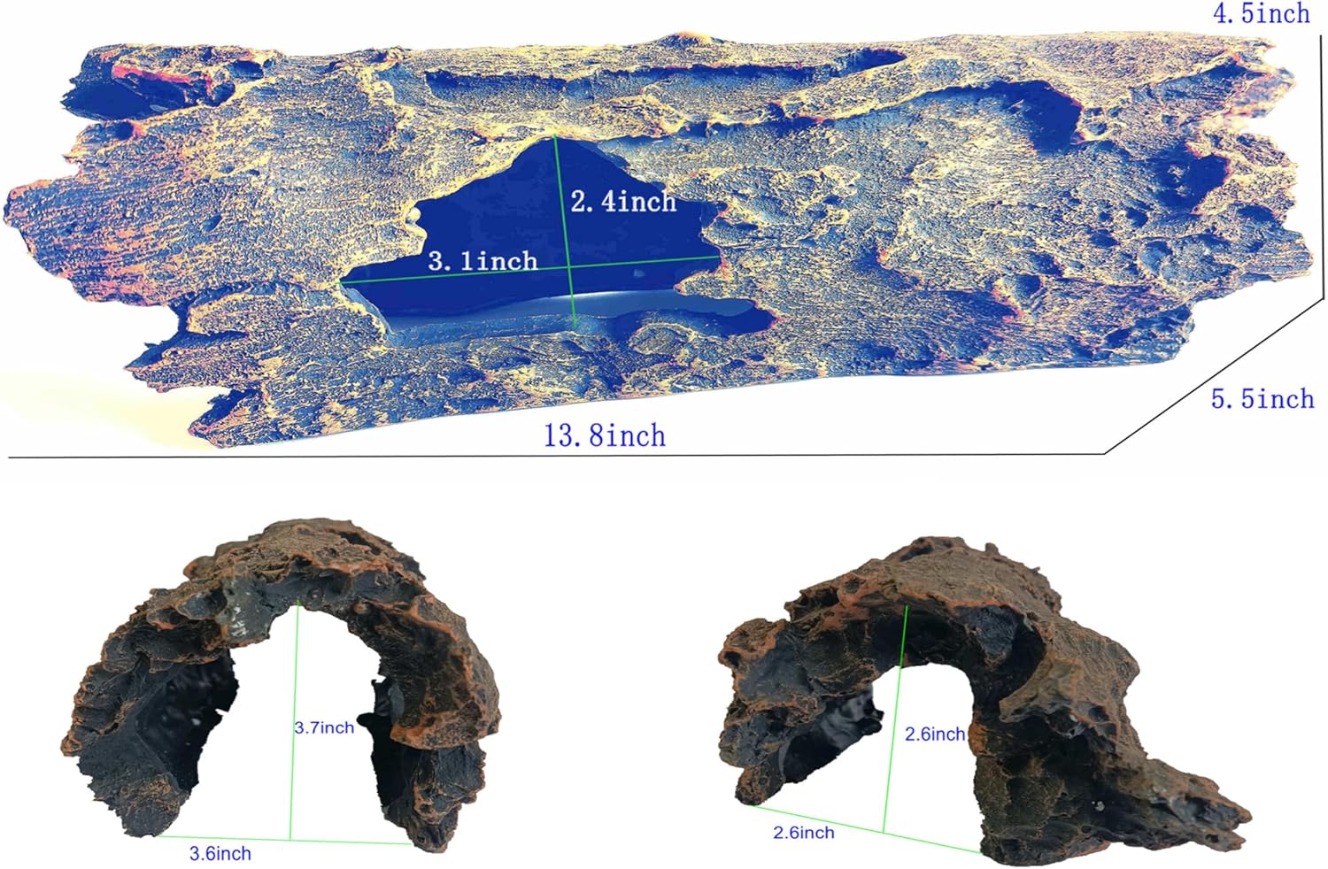 - 1.The design inspiration comes from nature. Simulated resin bark texture reptile hides is your first choice for reptile tank accessories.The natural colors and realistic bark textures create an original ecological living environment for reptiles.Young ball pythons , corn snakes and hamsters can hide in it or move through it.It's a bit small for an adult ball python. It can also be used as fish tank accessories,allowing your little fish and shrimp to happily hide and swim around.