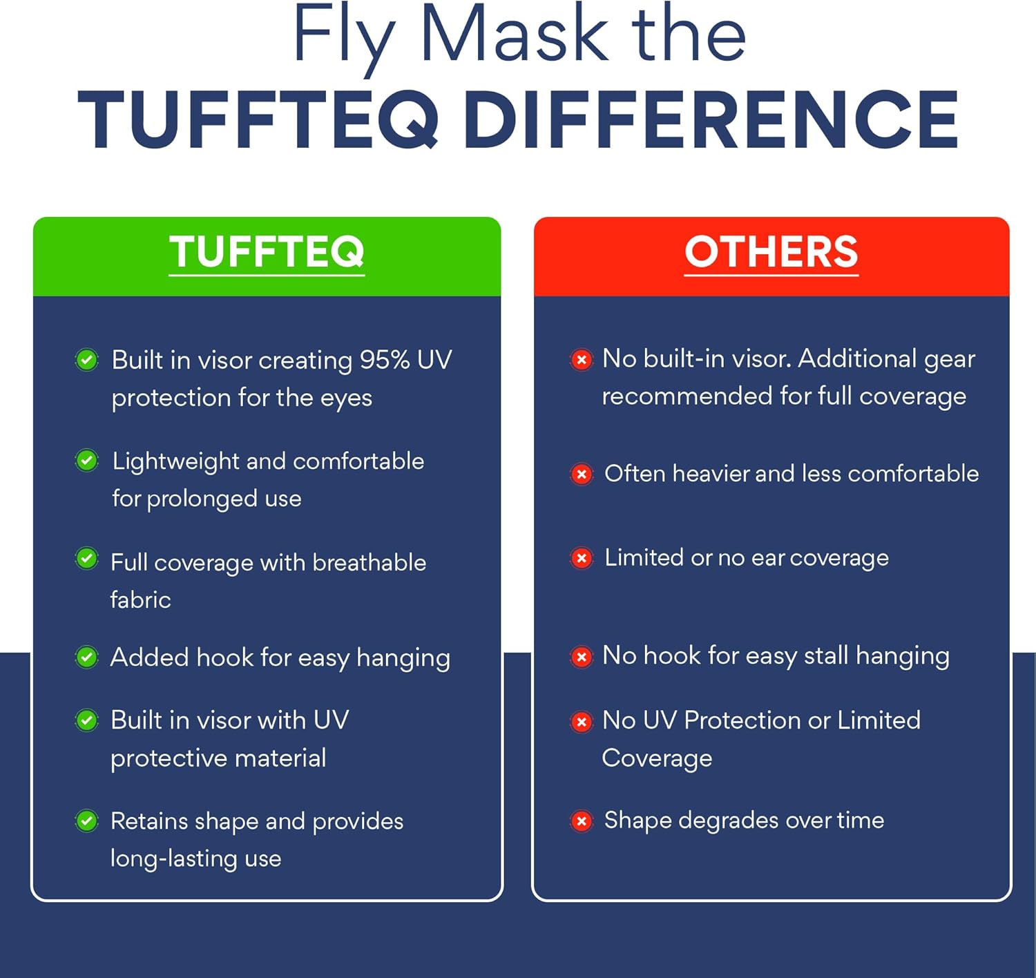 • ๐๐ฎ๐ข๐ฅ๐ญ-๐ˆ๐ง ๐•๐ข๐ฌ๐จ๐ซ ๐Ÿ๐จ๐ซ ๐„๐ง๐ก๐š๐ง๐œ๐ž๐ ๐”๐• ๐๐ซ๐จ๐ญ๐ž๐œ๐ญ๐ข๐จ๐ง: The TUFFTEQ Horse Fly Mask Without Ears Plus Size features a built-in visor designed to block harmful UV rays. This provides extra shade and reduces glare, offering enhanced protection for your horseโ€™s eyes and face during long hours outdoors.