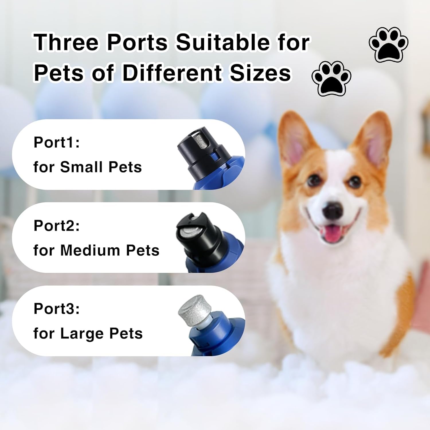 - Quiet Nail Grinder for Dogs: 2 rotation speed settings and 3 grinding ports are suitable for pets of different breeds and sizes. You can choose the appropriate port to trim dog nails of different thicknesses and lengths. The noise level of the electric dog nail trimmer is maintained at around 40 decibels, allowing your pet to enjoy a quiet dog nail grinder
