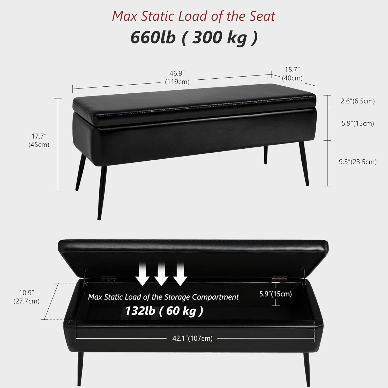 Leather Storage Ottoman Bench,End of Bed Bench for Living Room Bedroom Dinning Room Entryway,Mid-Century Modern,Faux Leather,with Steel Legs,Safety Hinges,Loads 660 lb (Without Button, Black)