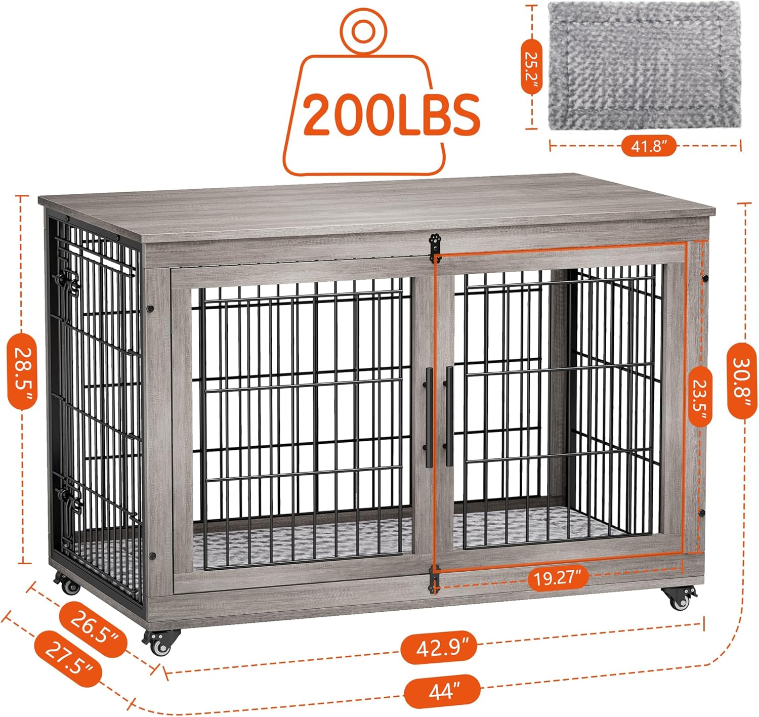 Lulive Dog Crate Furniture, XL Wooden Dog Kennel Indoor Double Doors Dog Cage, 44'' Heavy Duty Dog Crate with Cushion & Wheels, Decorative End Table Chew-Resistant for Extra Large/Medium, Grey