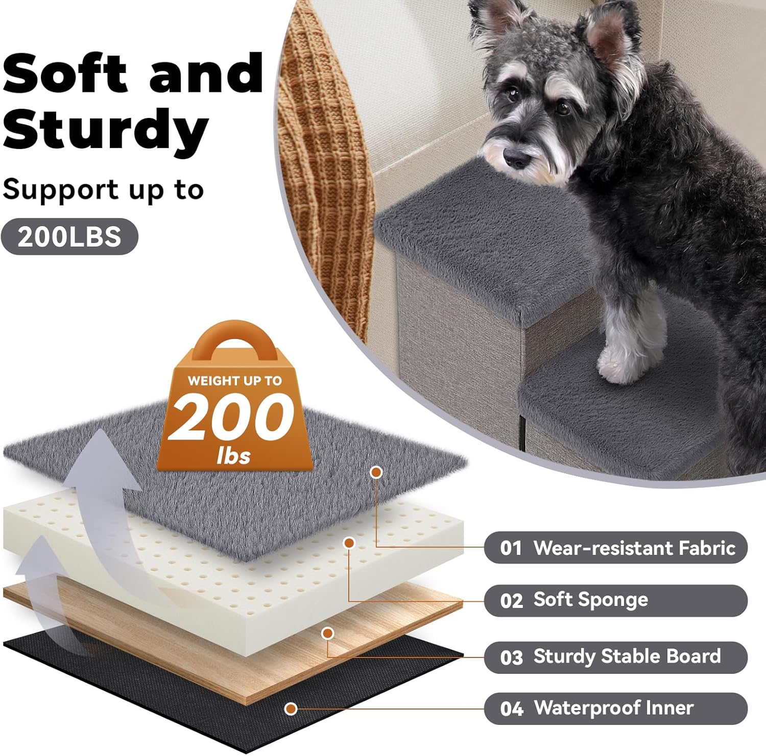 - MORE STABLE AND COZY: Zerbuger dog stairs are made of MDF and include foam, which relieves pressure on pets' paws and joints. Our pet steps are perfect as a warm GIFT for you hurt, disabled and elderly dogs. The removable board pads are placed inside to ensure that the pet steps are stable enough without any wobbling. The non-slip bottom ensures that the pet steps don't move. The dog stairs can support up to 200 LBS.
