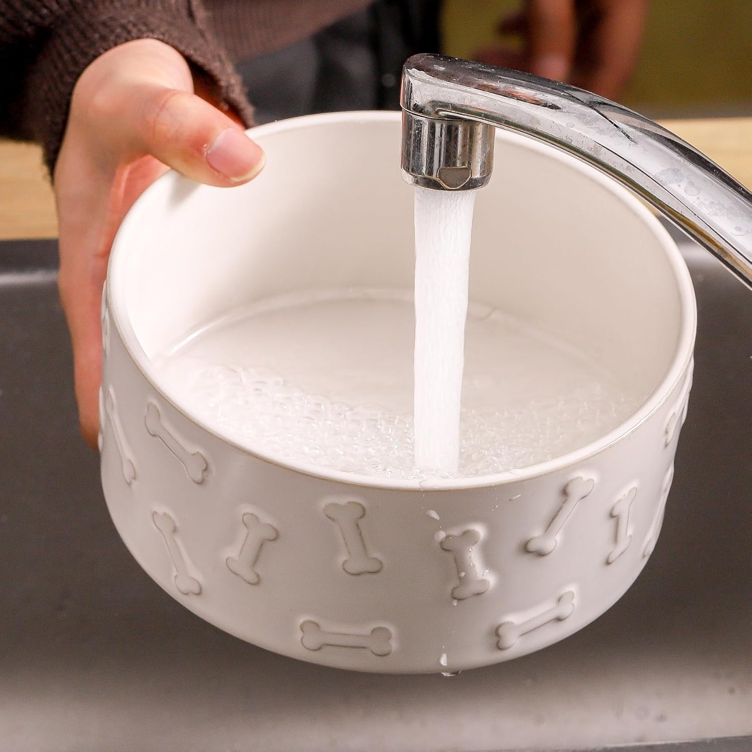 UBEE Ceramic Dog Bowl Set of 2, 6.1 inch Dog Food Bowl Dish with Bone Paw Pattern, Pet Food Water Dish Feeding for Small and Meidum Dogs and Large Cat, White