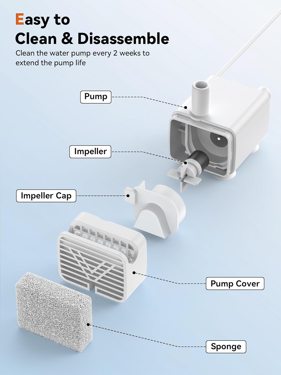 - Easy to Monitor and Maintenance: The pet water fountain features a transparent window for easy monitoring of water levels. It features dry burn protection that automatically stops the flow of water to prevent the pump from drying out. It’s also easy to disassemble and clean, with dishwasher-safe components, making maintenance a breeze.