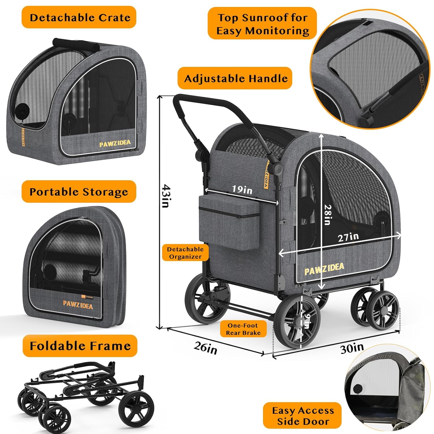 - Ample Storage & Feeding Convenience -Includes feeding windows on the side doors, dual storage pockets, and a detachable organizer bag to carry essential pet supplies. Extra large dog stroller can safely care for and take care of your pet during outdoor adventures or travel.