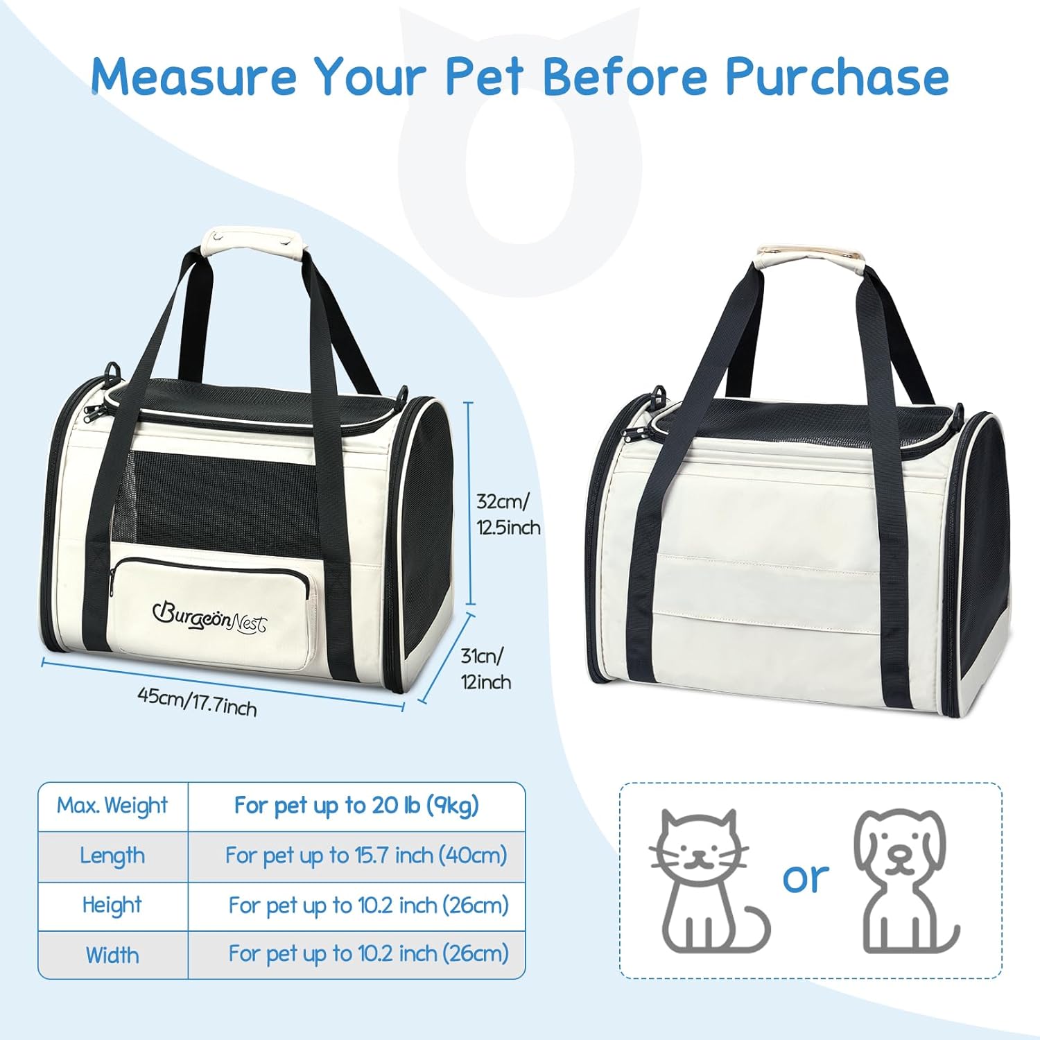 • Soft Cat Carrier: BurgeonNest Pet carrier measures 17.7"L x 12"W x 12.5"H, weights 2.5 lbs perfect for pets under 20 lbs; ideal for travel/ vacation/ leisure/ hiking/ car/ outdoor activities etc.