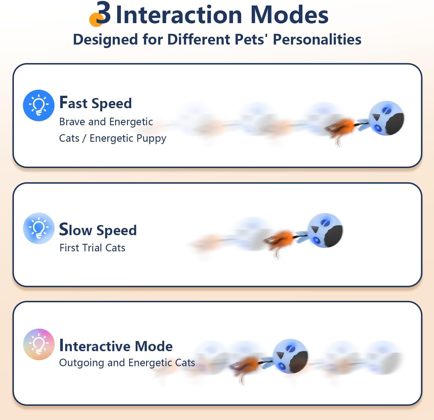 • 🐥CAT AFTER MOUSE GAME: Interactive cat toys ball with a teaser feather tail is shaken or swung in front of the cat, imitate the random movement of small animals, emit sounds and LED flashing attract cats' attention, prompting cats to chase, jump and run. let cats experience a "natural" game, enhance the sense of reality and satisfaction. Through fast and random movements, helping cats consume excess energy and stay energetic and healthy.