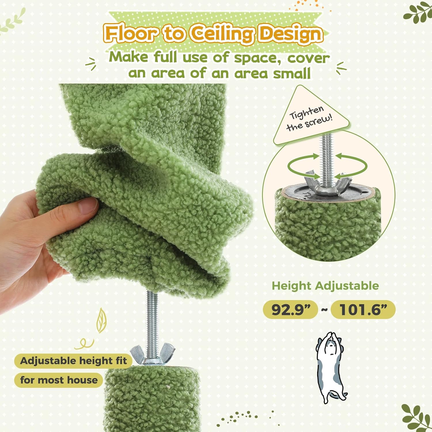 PEQULTI Floor to Ceiling Cat Tree 92.9’’-101.6’’ Height Adjustable Cat Tower Tall Kitty Climbing Play House with Scratching Posts, Cozy Condo, Perches and Large Hammock for Indoor Cats Green
