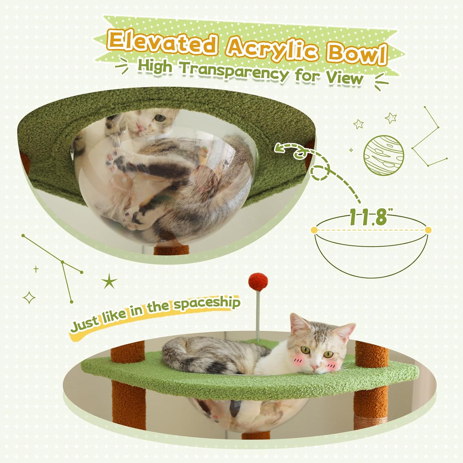 - IDEAL REST AREA: No matter your cats need to lounge in the cradle, have a private nap in the cozy condo, cuddle in the plush hammock or just take a break on the perches, they could find their exclusive zone in no time. The elevated acrylic nest is not only a fashionable bed for your furry friends, but also an observation deck to enjoy the superb view out of the window