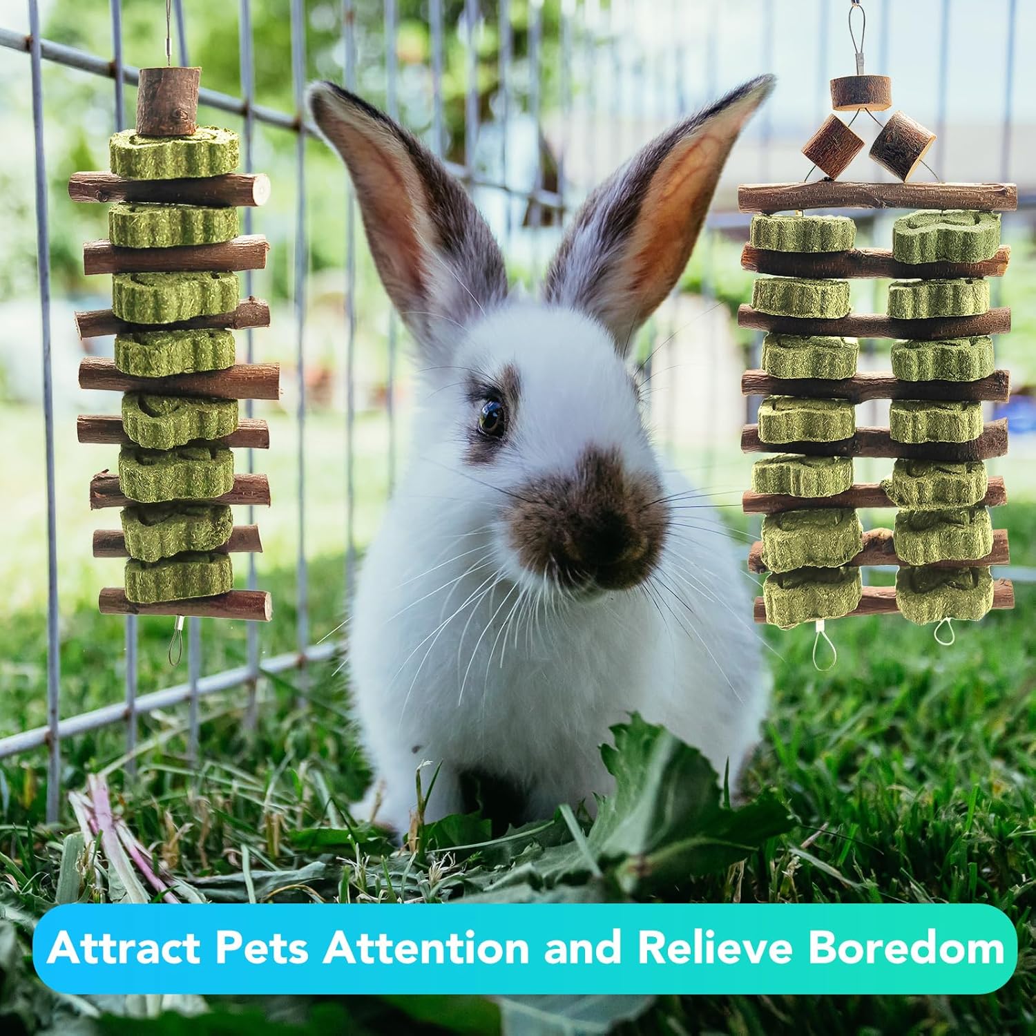 - Fun string hanging design, inspiring vitality -- detachable grass cakes and peach wood blocks can be flexibly combined and hung in cages or held for interaction, satisfying the exploratory nature of rabbits and reducing the need for disassembly.