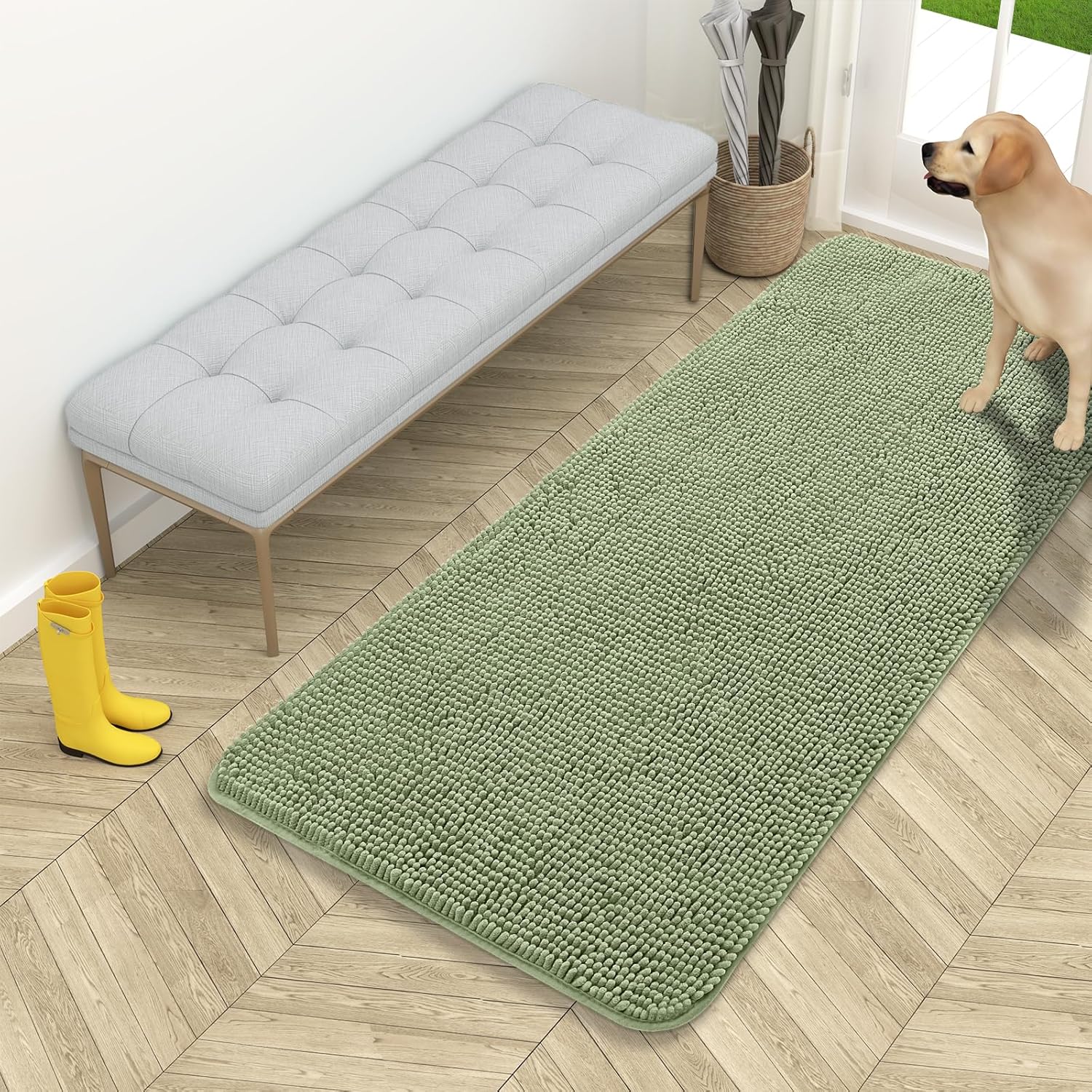 OLANLY Dog Door Mat for Muddy Paws 54x24, Absorbs Moisture and Dirt, Absorbent Non-Slip Washable Doormat, Quick Dry Chenille Mud Mat for Dogs, Entry Indoor Entryway Carpet for Inside Floor, Sage Green